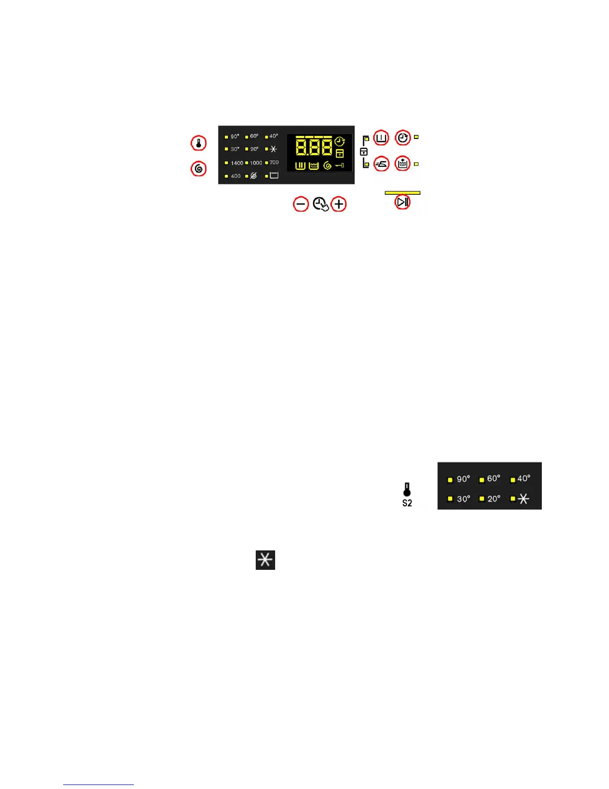 The temperatures available (displayed in °C) are: 90°C, 60°C, 40°C, 30°C, 20°C cold cycle.