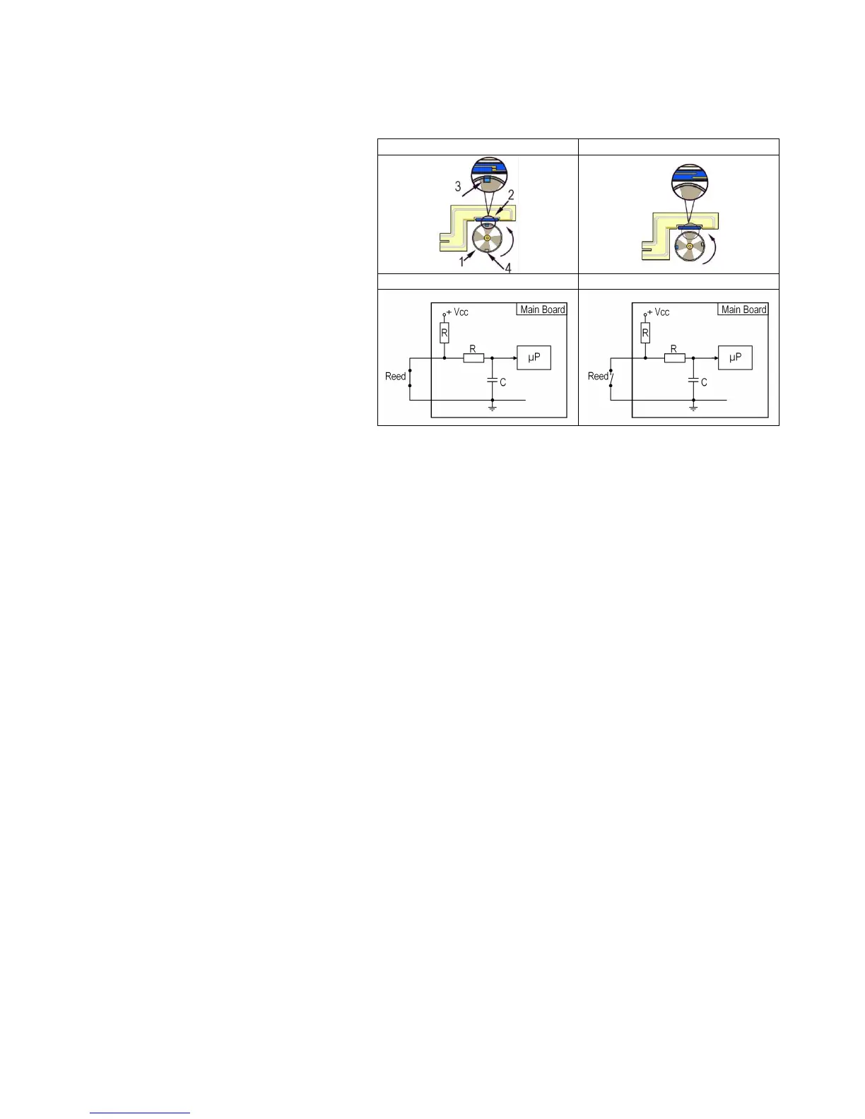 Water entering the solenoid valve rotates the turbine (1) and magnet (3), which passes in front of the Reed