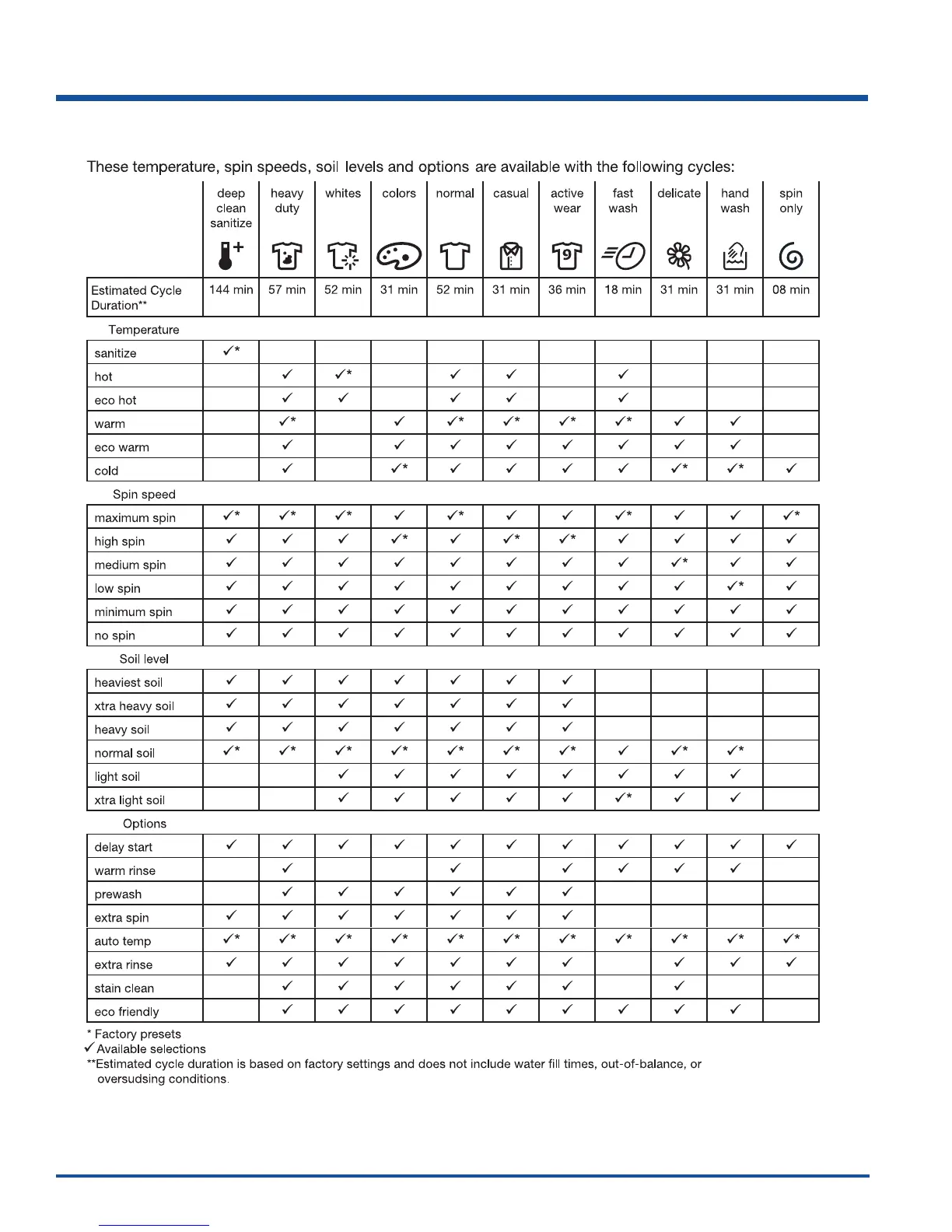Electrolux EWFLW65H - Wave-Touch Washer Cycle Chart