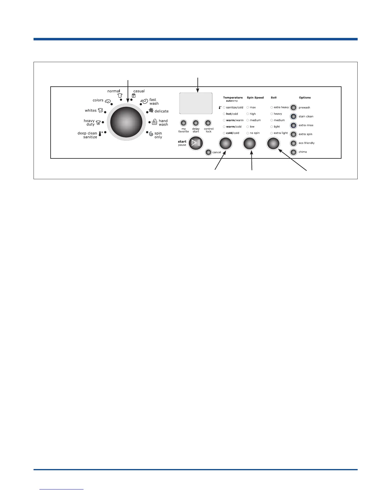 To return to factory default settings, press and hold the spin speed and soil buttons at the same time for 5 seconds.