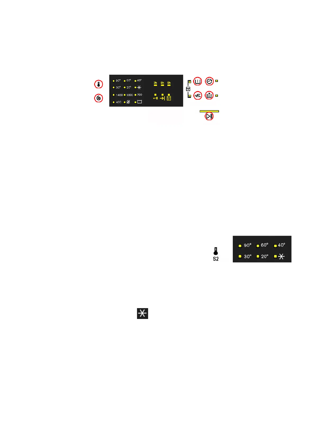 The temperatures available (displayed in °C) are: 90°C, 60°C, 40°C, 30°C, 20°C cold cycle.