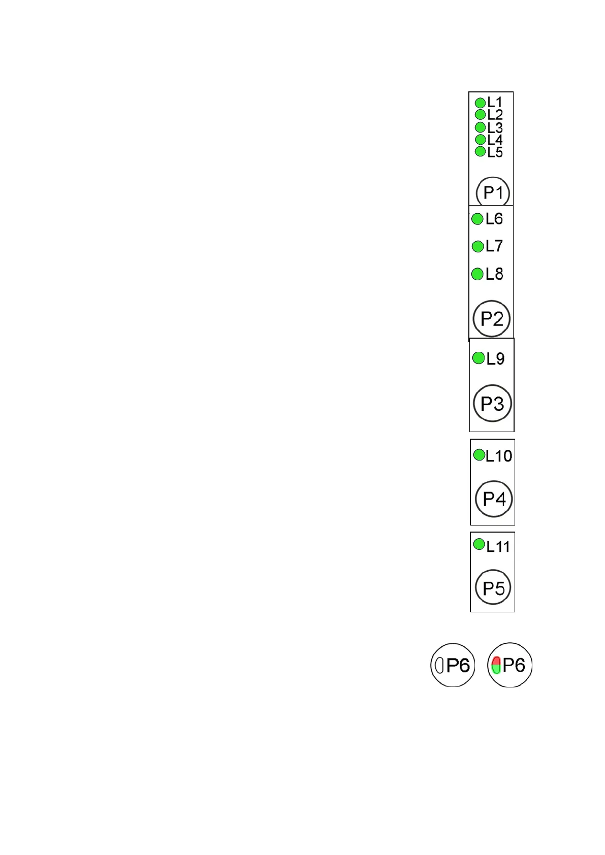 a red one that flashes (150 ms off, 150 ms on) in the event of an alarm or incorrect selection, such as: