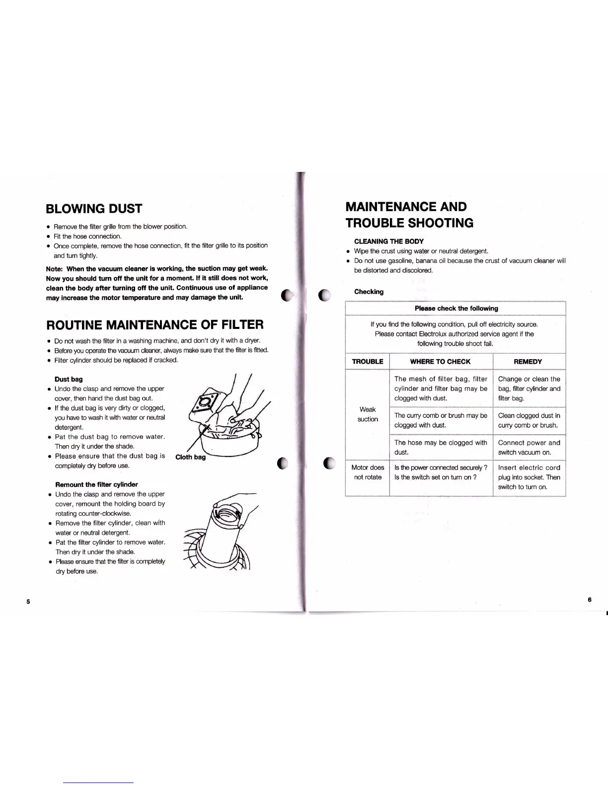Electrolux Flexio Z803 - BLOWING DUST; Blower Function Setup; ROUTINE MAINTENANCE OF FILTER; Filter and Dust Bag Care
