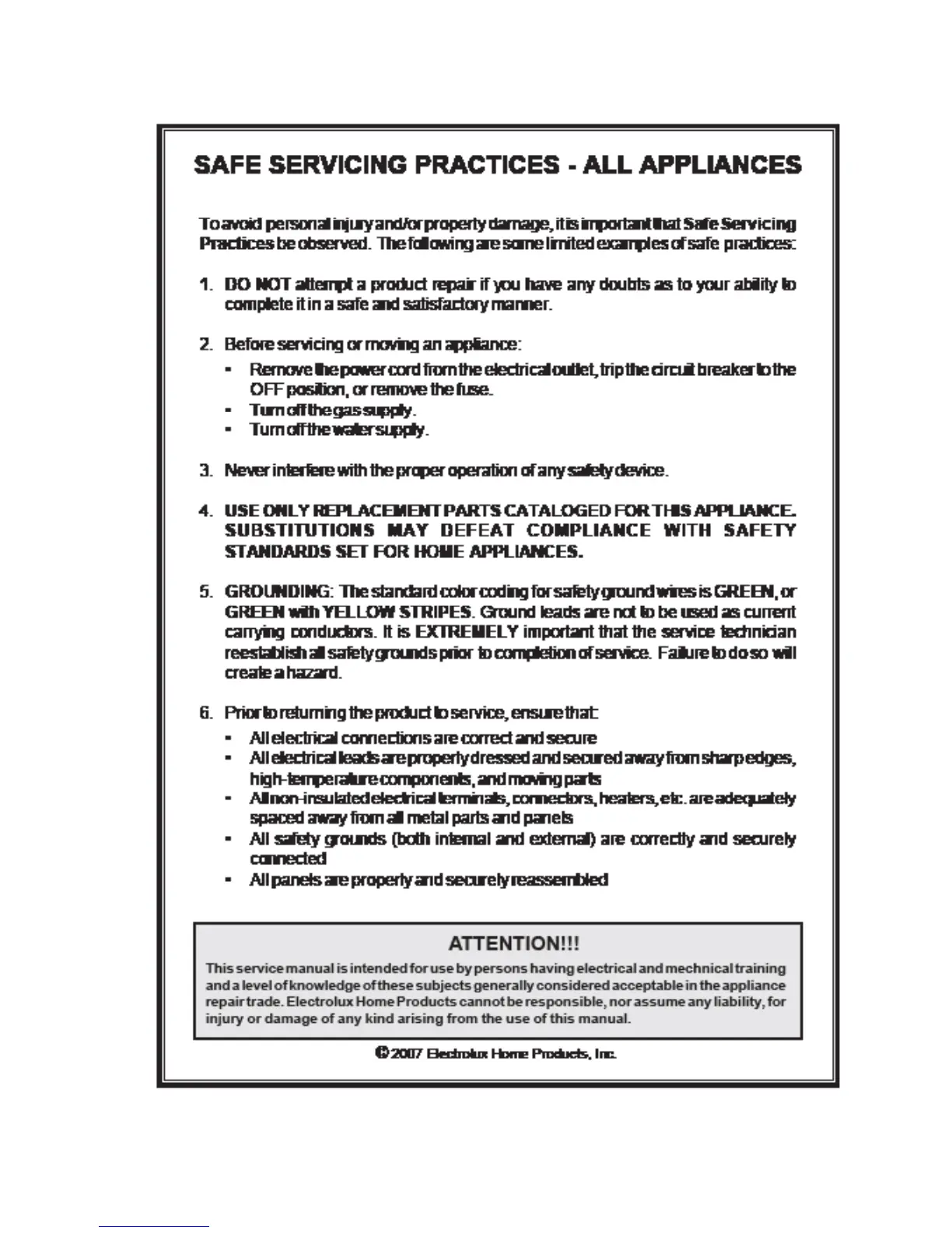 Electrolux FMB330RGC0 - Safe Servicing Practices; General Safety Precautions; Pre-Servicing Checks; Replacement Parts Policy