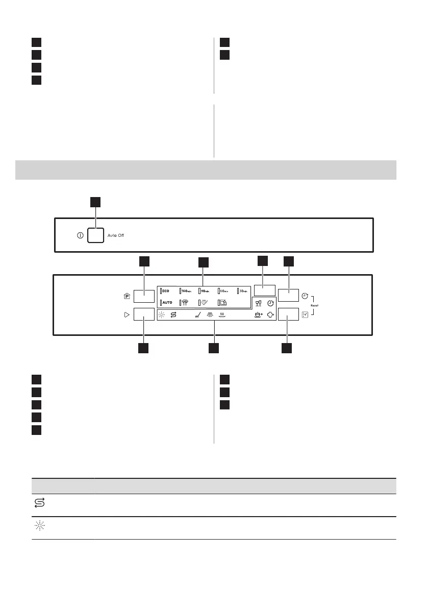 Rinse aid indicator. It is on when the rinse aid dispenser needs refilling. It is always off while