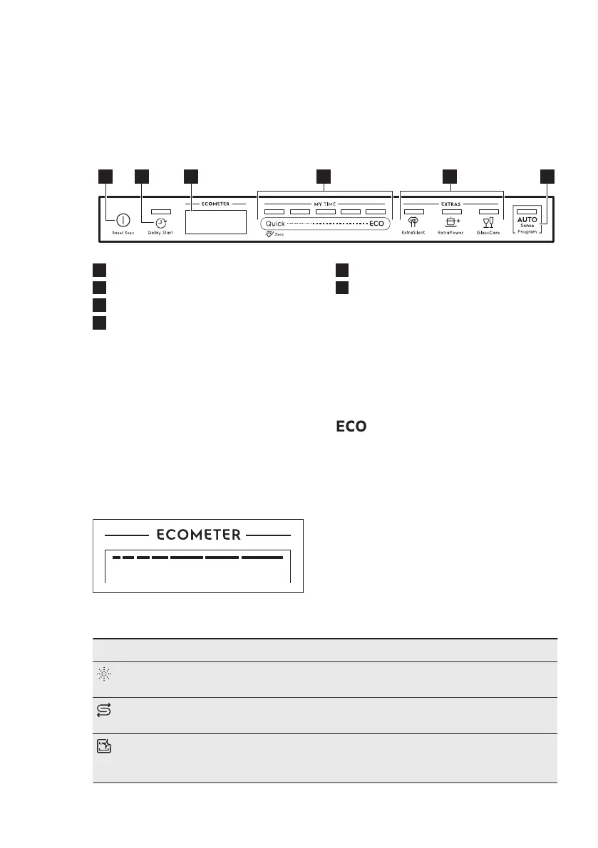 Rinse aid indicator. It is on when the rinse aid dispenser needs refill‐