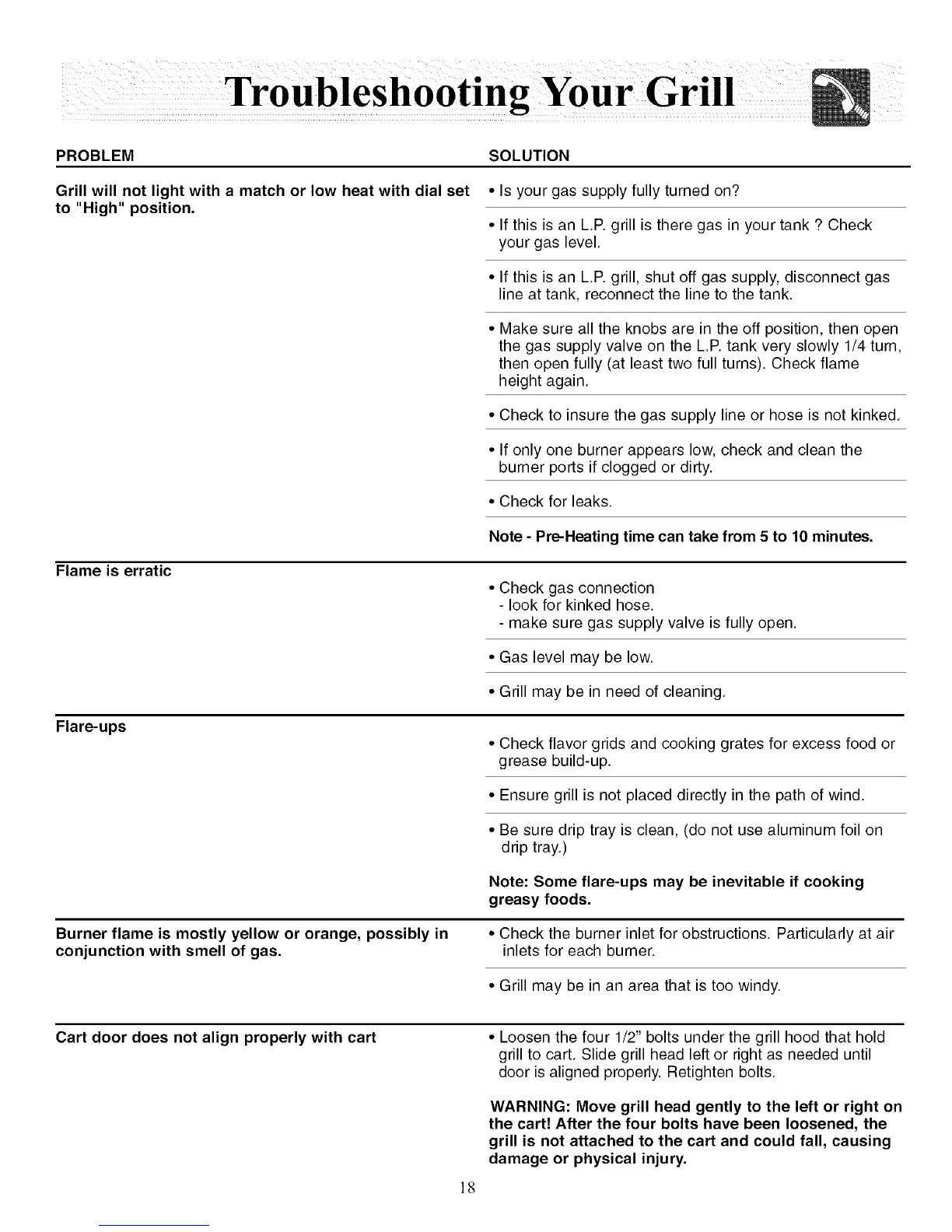 Cart door does not align properly with cart • Loosen the four 1/2" bolts under the grill hood that hold