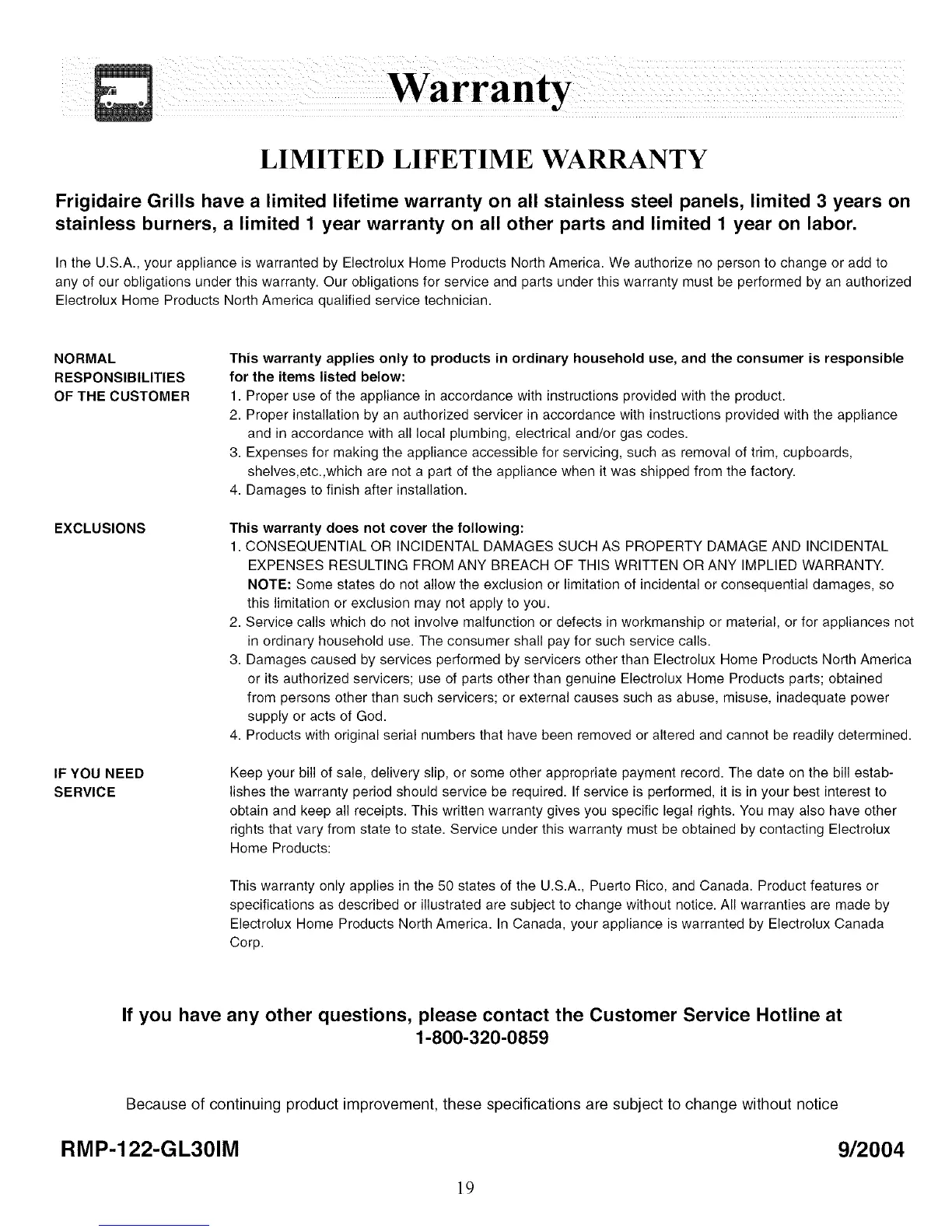 Frigidaire Grills have a limited lifetime warranty on all stainless steel panels, limited 3 years on