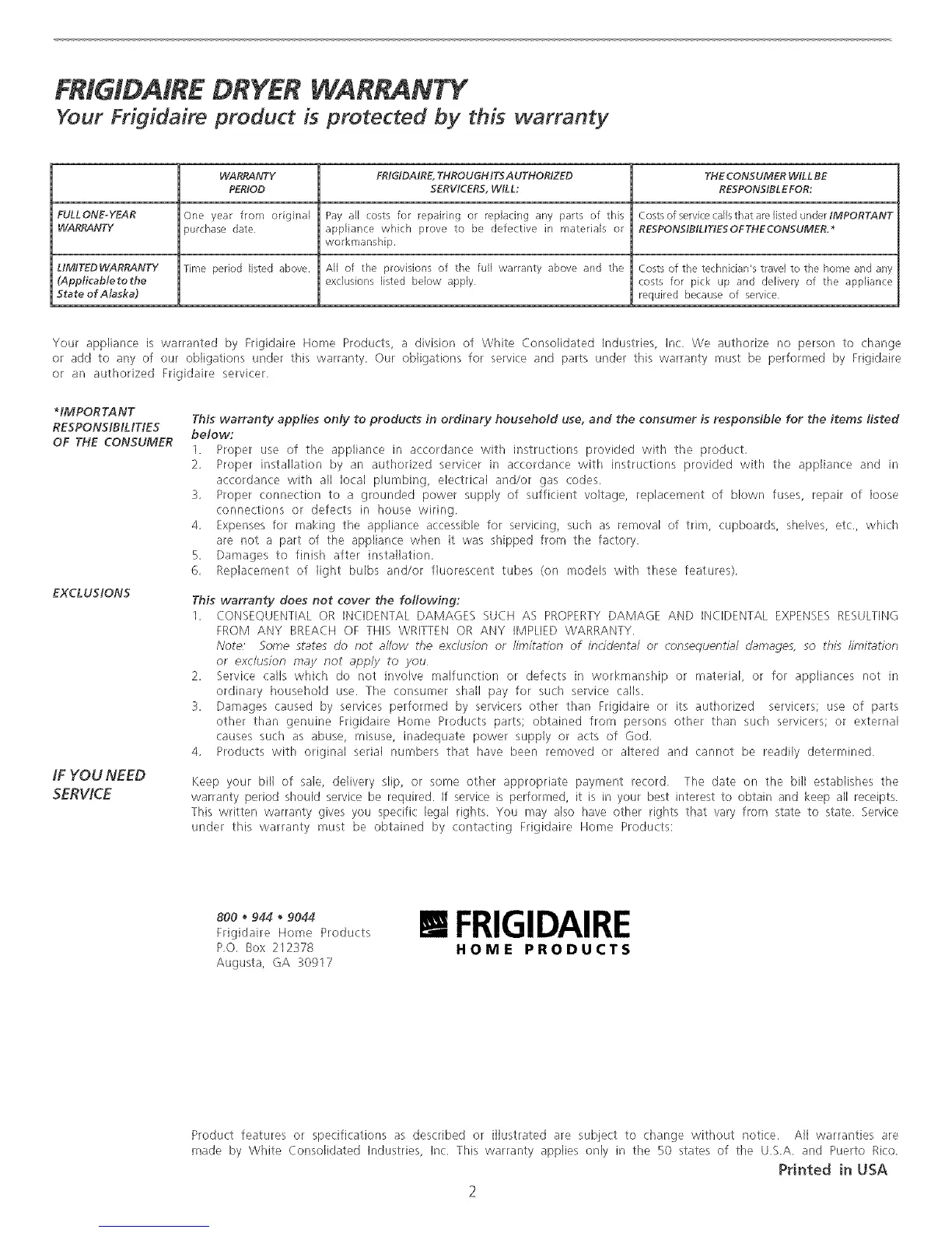 under this warranty must be obtained by contacting Frigidaire Home Products: