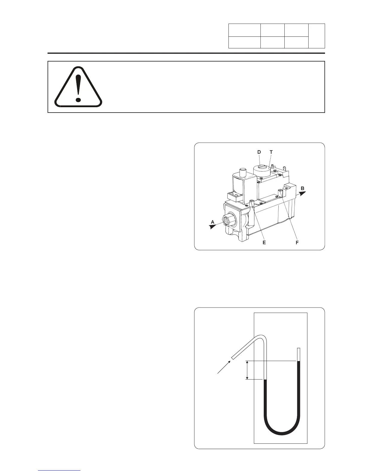Open and check the gas inlet main burner using the manometer on the pressure tapping (F).