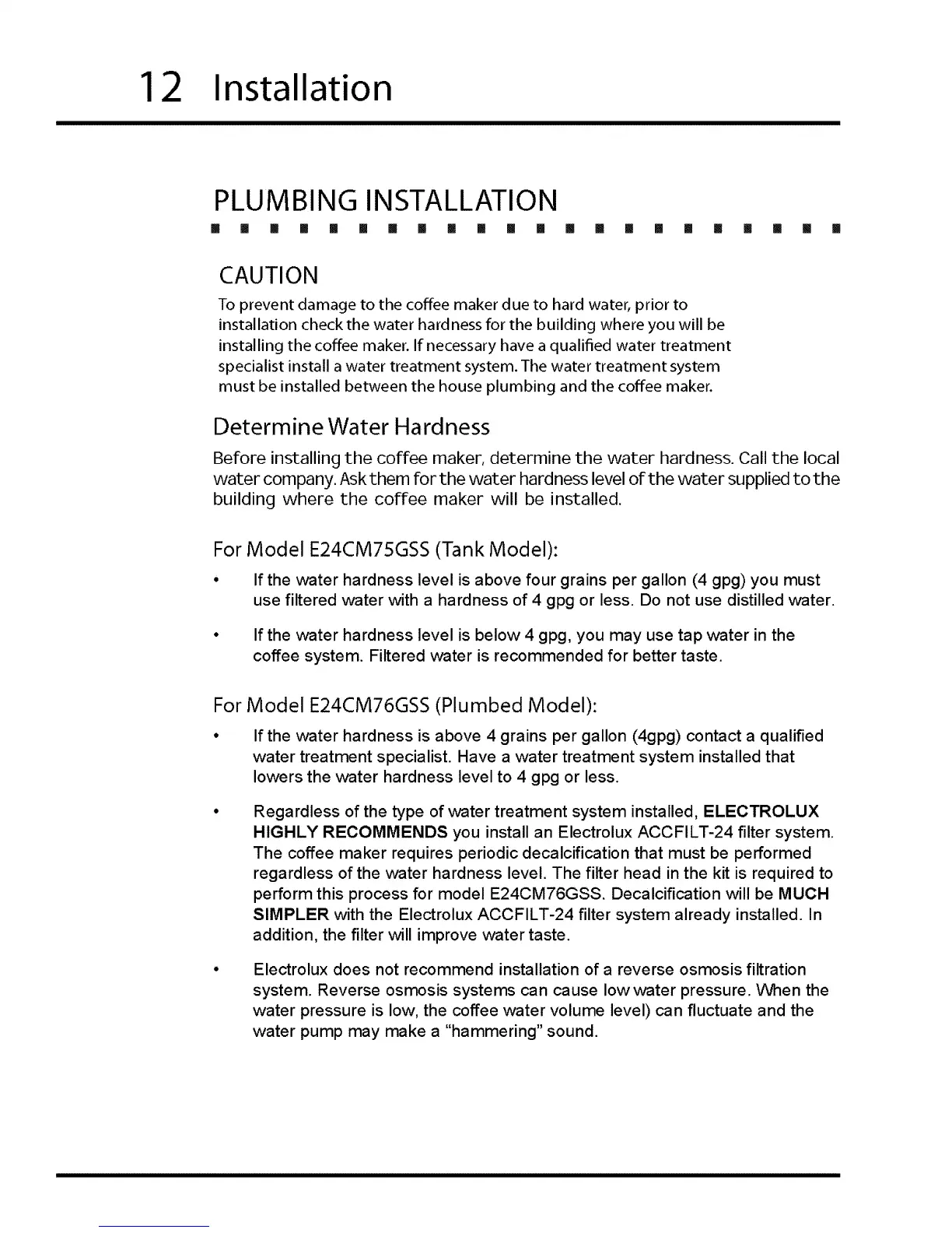 installing the coffee maker. If necessary have a qualified water treatment