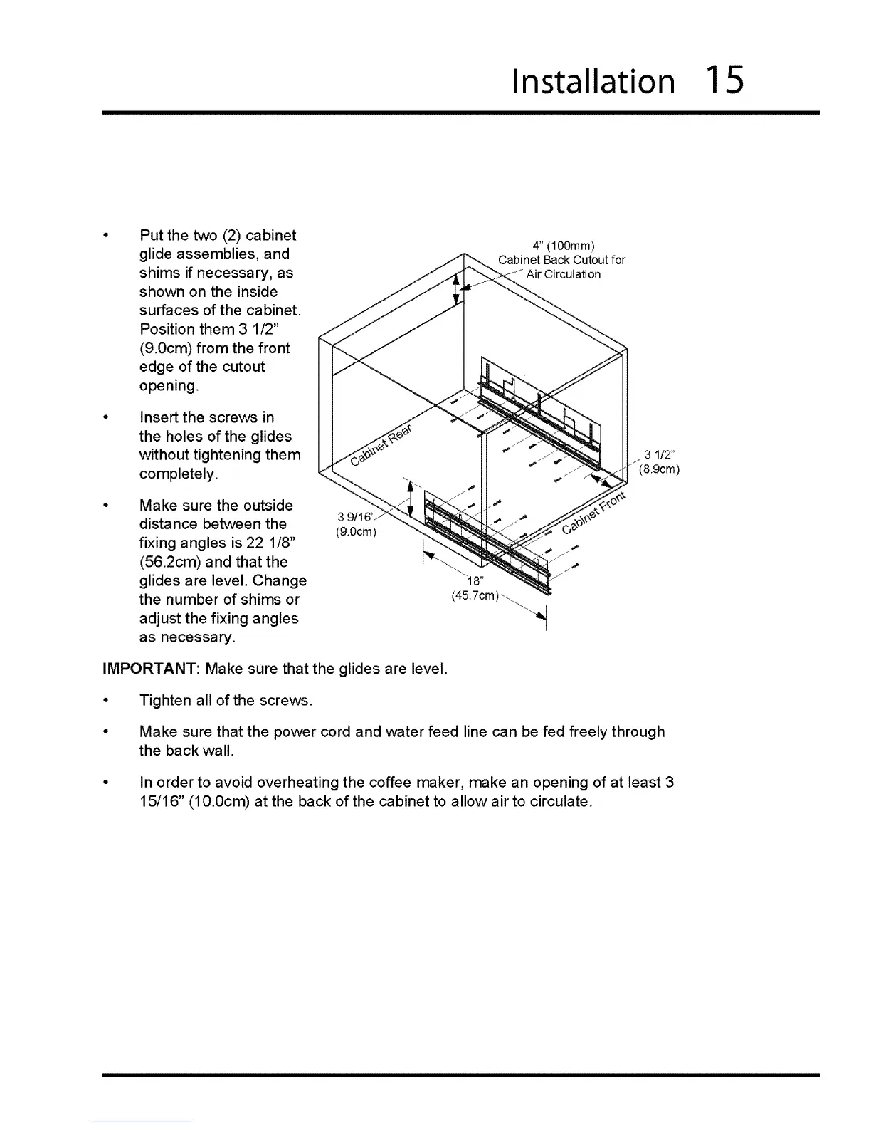 15/16" (10.0cm) at the back of the cabinet to allow air to circulate.