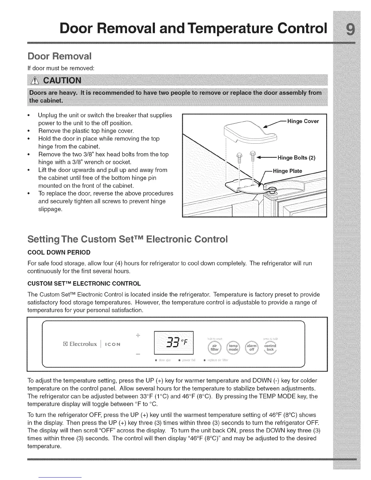 The refrigeratorcanbeadjustedbetween33 F(1 C) and46 F(8 C). BypressingtheTEMPMODE key, the