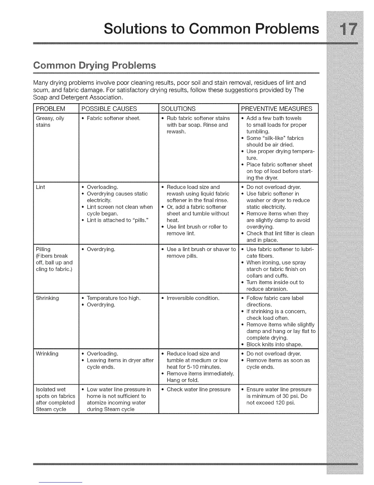 Many drying problems involve poor cleaning results, poor soil and stain removal, residues of lint and