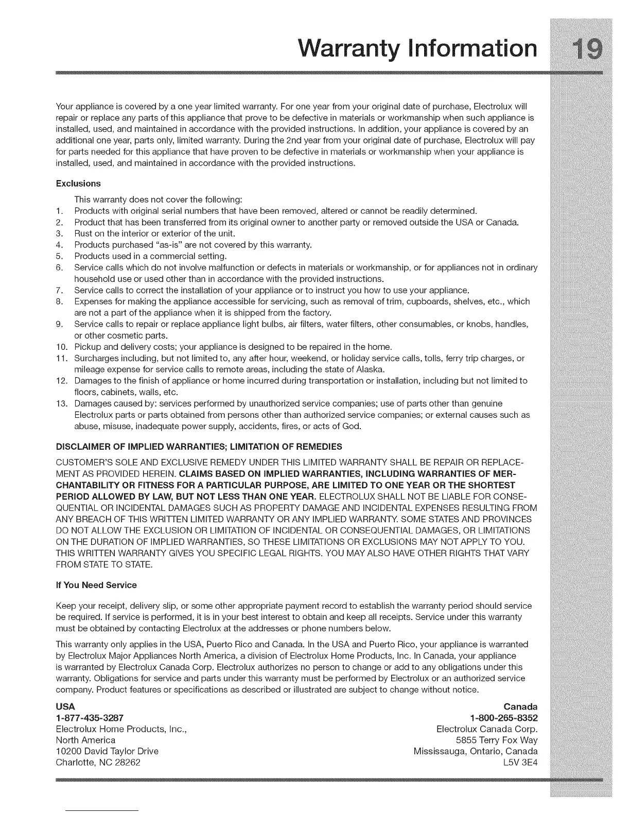 warranty. Obligations for service and parts under this warranty must be performed by Electrolux or an authorized service