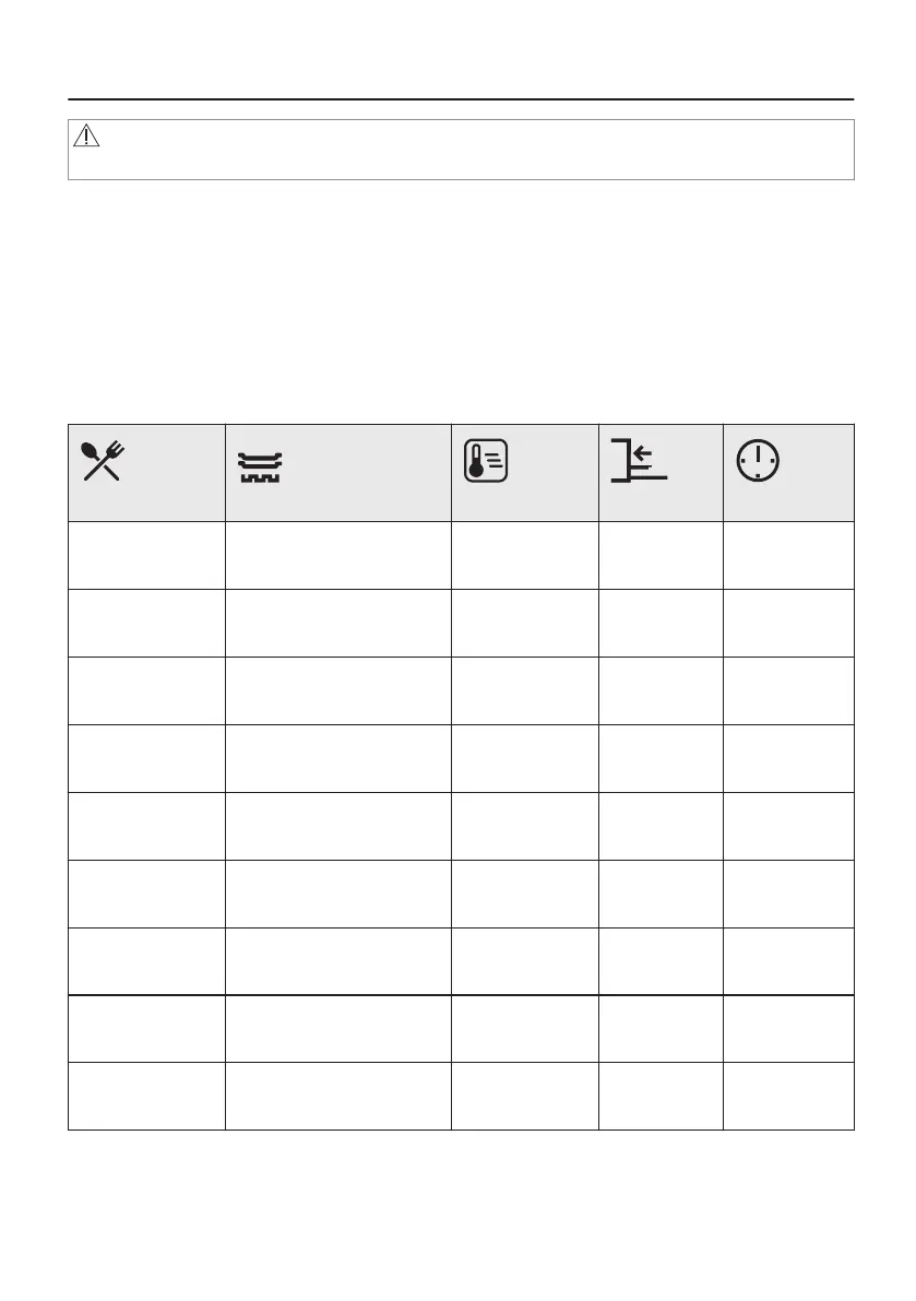 recommended settings for temperature, cooking time and shelf position for specific types of the