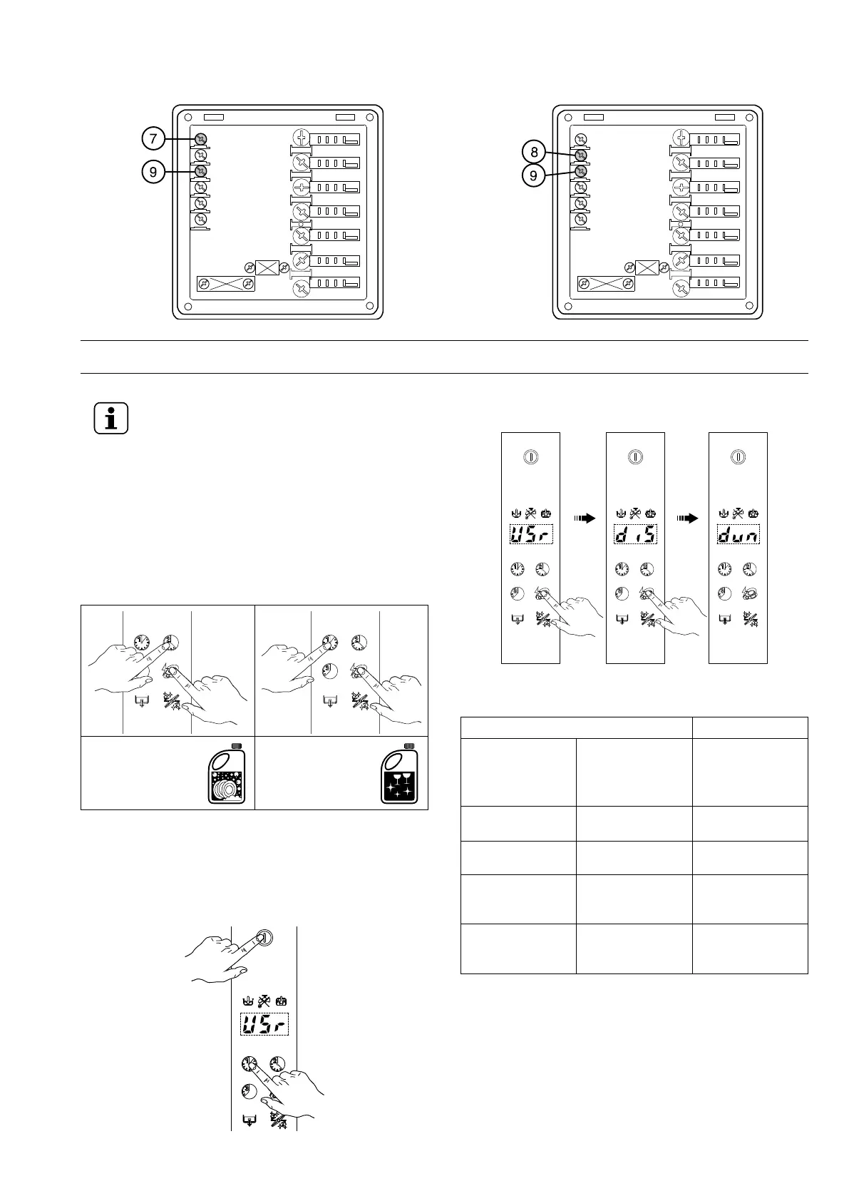 • Connect the rinse-aid dispenser between terminals 8 and 9.