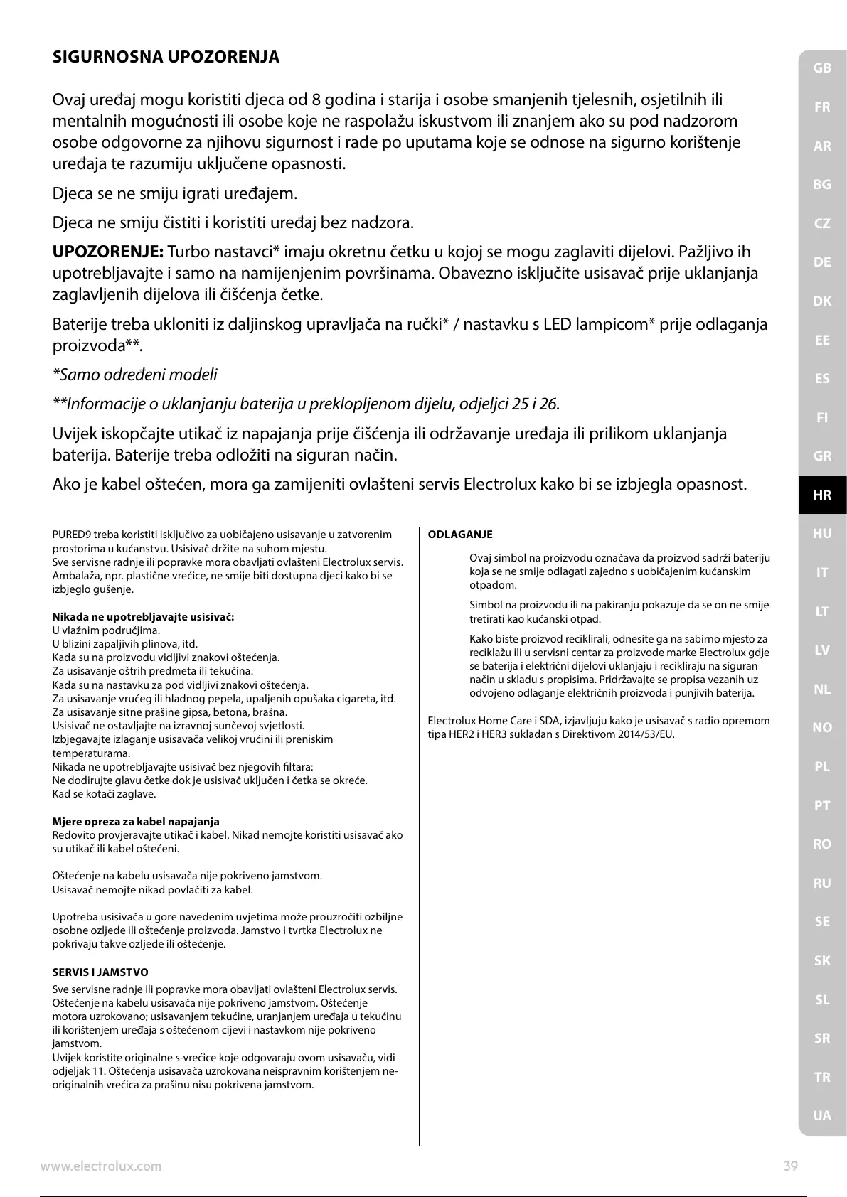 Ako je kabel oštećen, mora ga zamijeniti ovlašteni servis Electrolux kako bi se izbjegla opasnost.