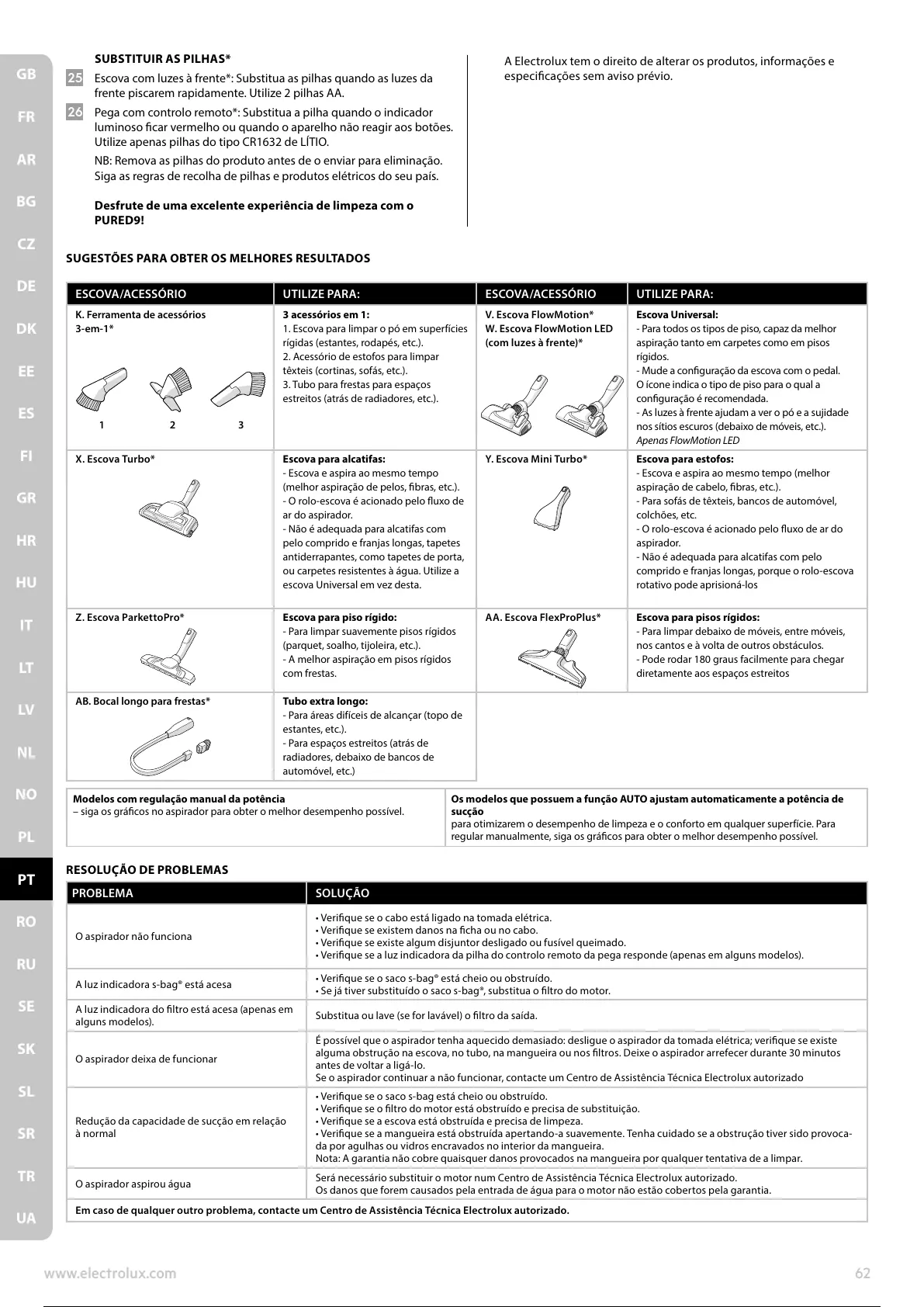 Se o aspirador continuar a não funcionar, contacte um Centro de Assistência Técnica Electrolux autorizado