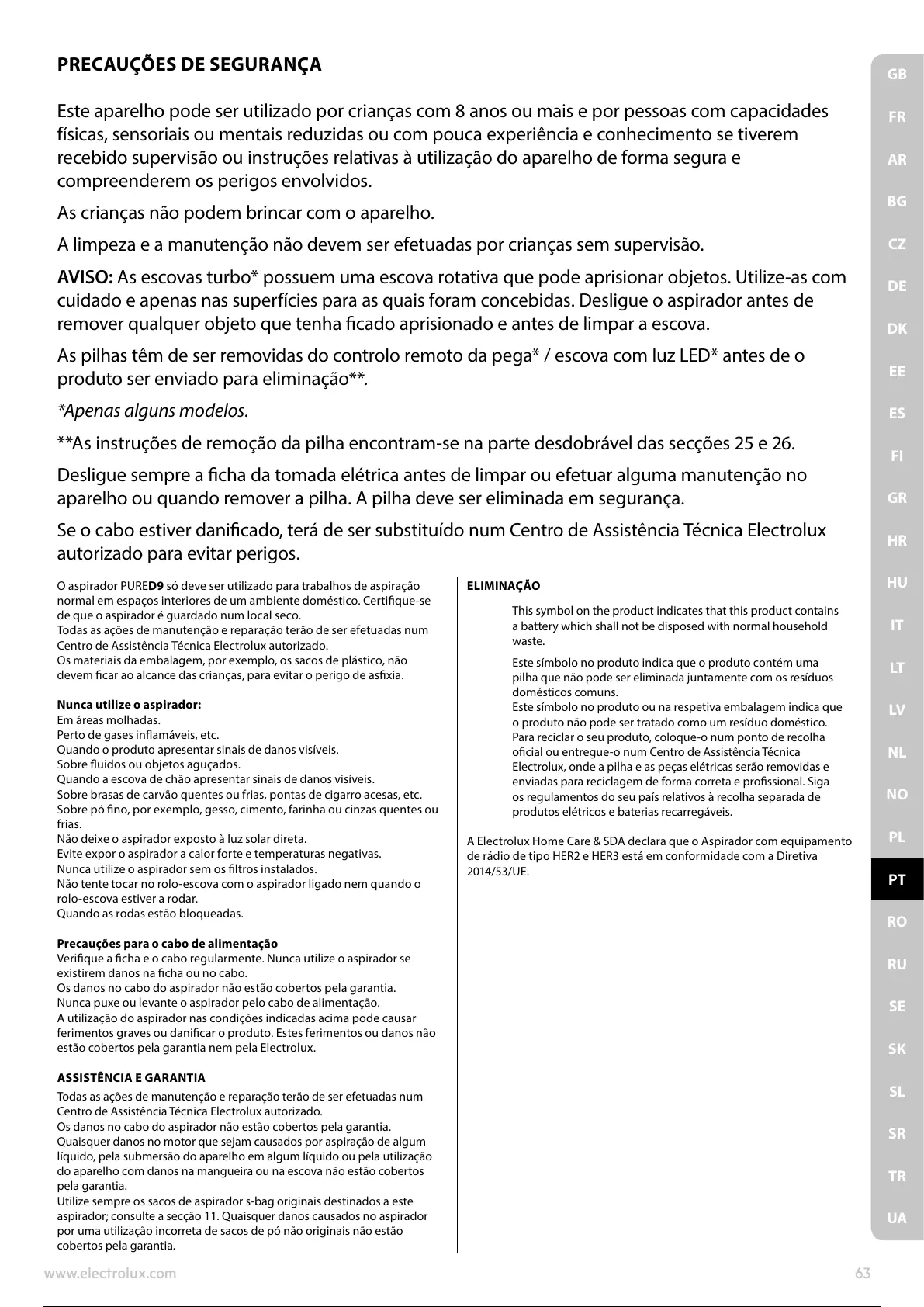 Se o cabo estiver danicado, terá de ser substituído num Centro de Assistência Técnica Electrolux