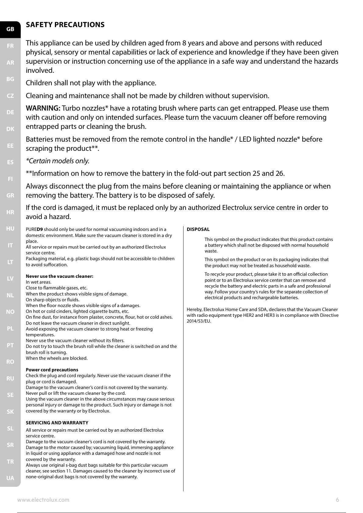 Hereby, Electrolux Home Care and SDA, declares that the Vacuum Cleaner