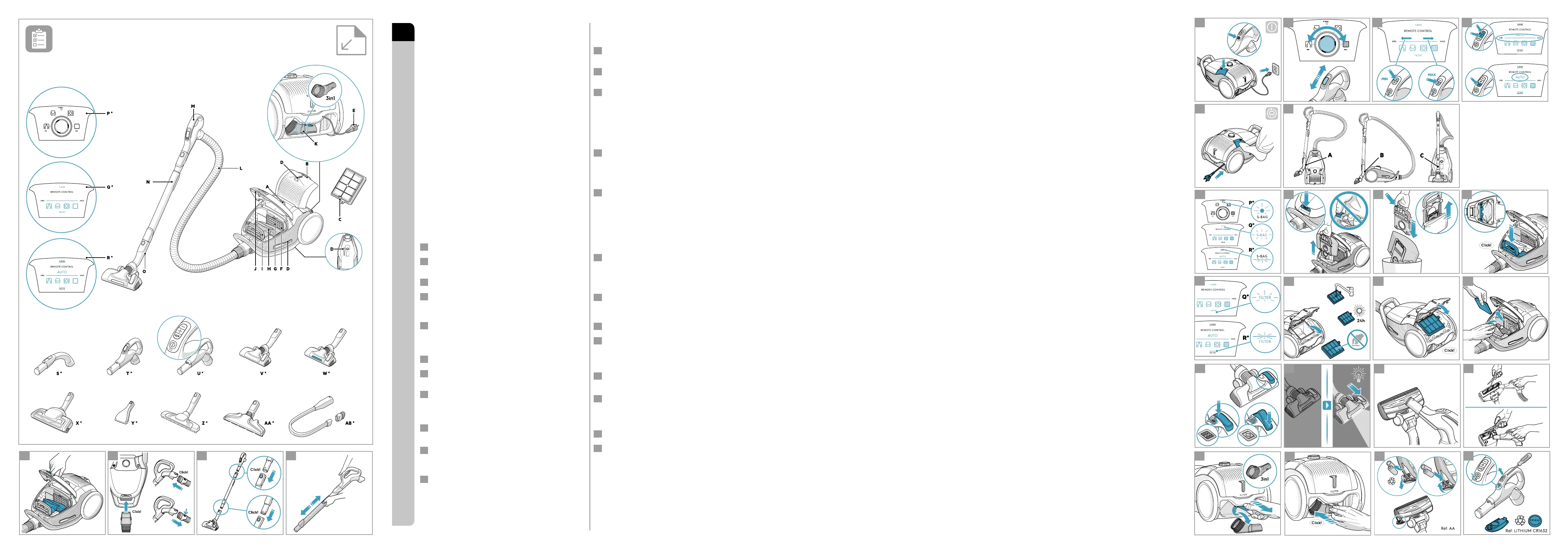 7 Adjust suction power (remote control models): Press +/- button on the