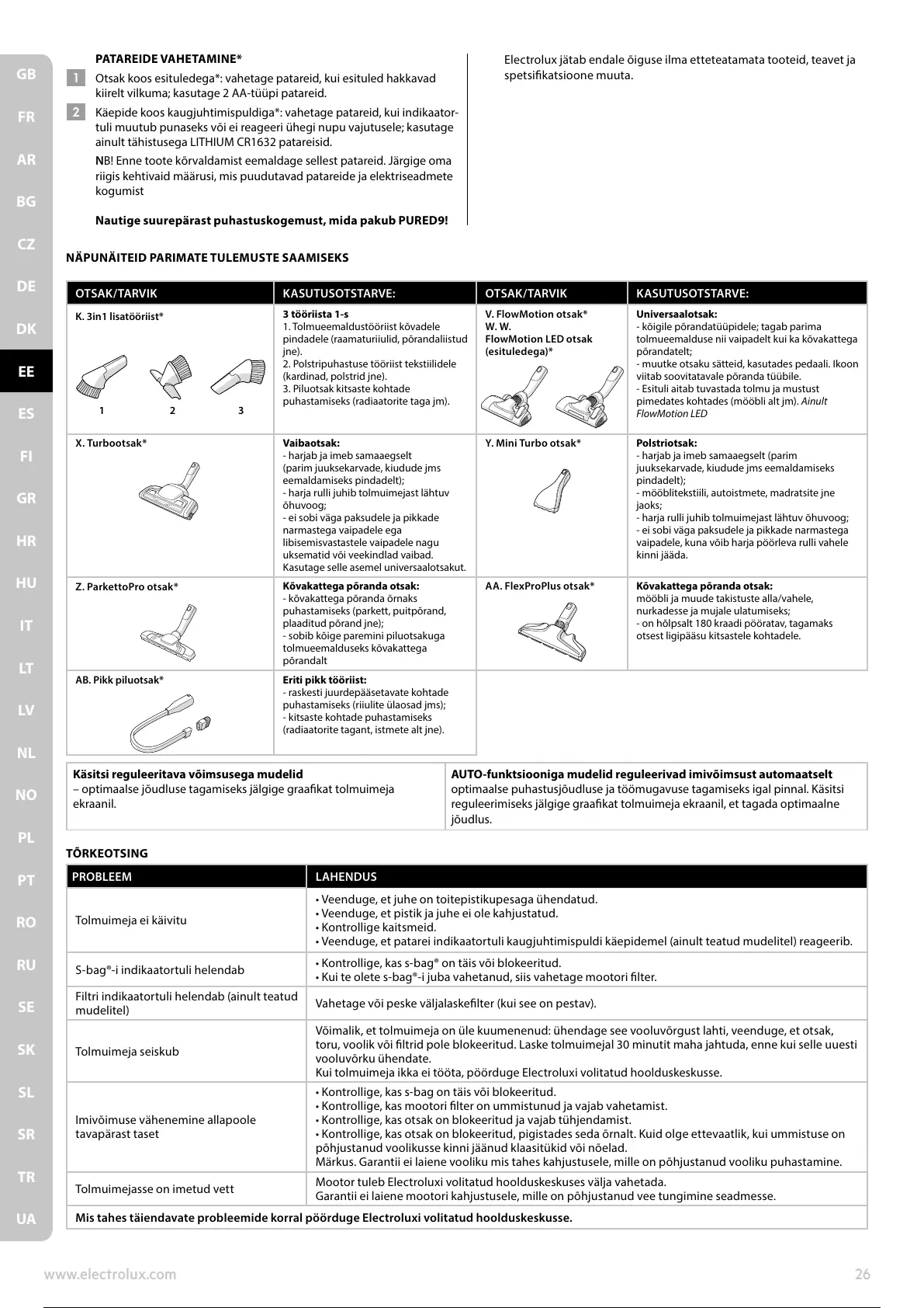Mis tahes täiendavate probleemide korral pöörduge Electroluxi volitatud hoolduskeskusse.