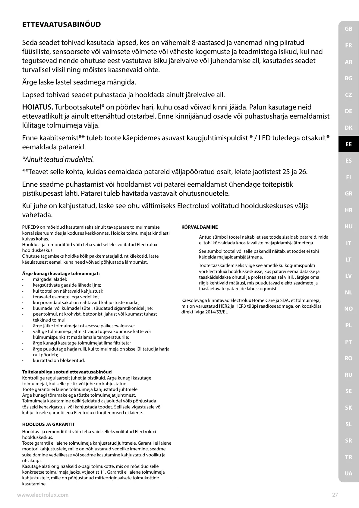 kahjustusele garantii ega Electroluxi tugiteenused ei laiene.