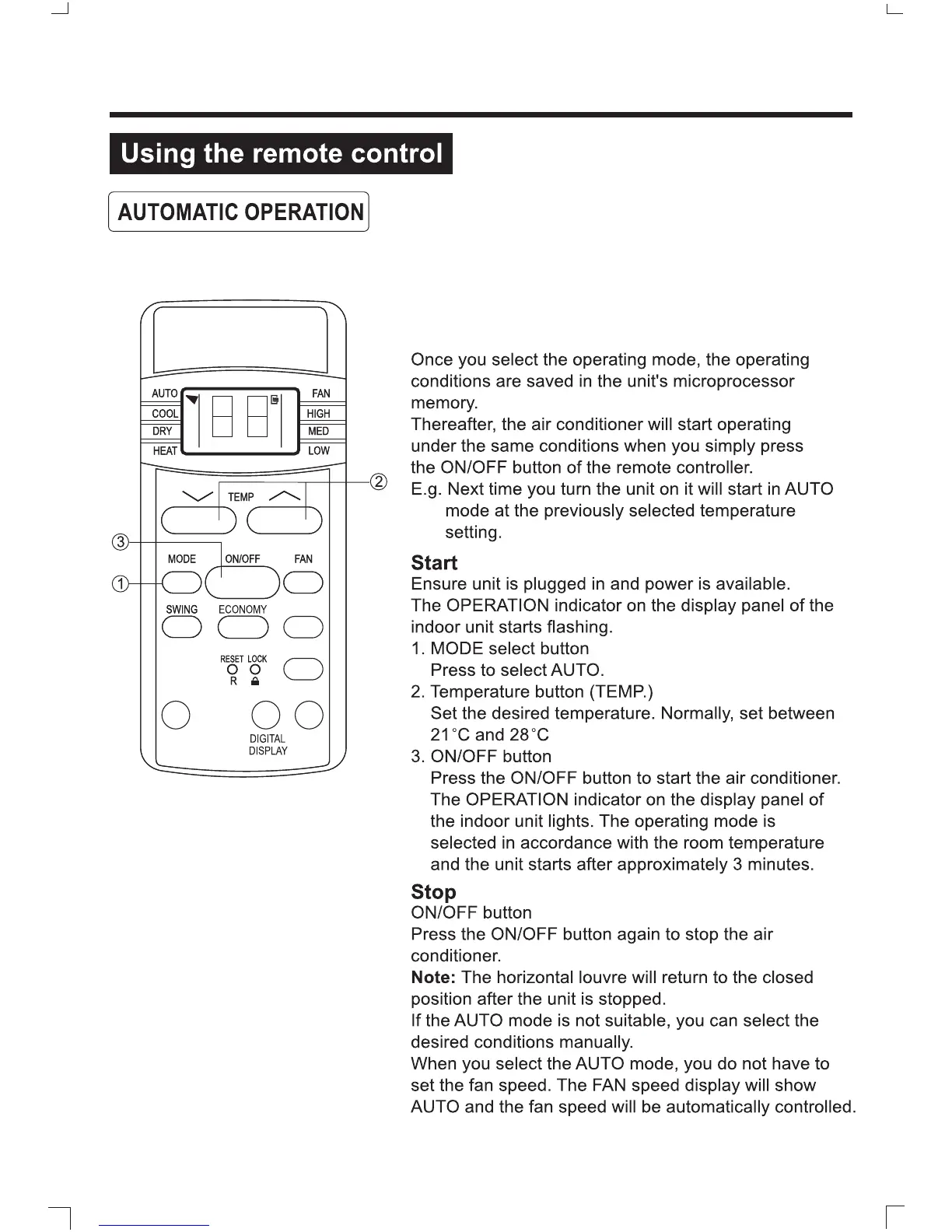 Electrolux R410A - Remote Control Operations; Automatic Operation; Cool;Heat;Fan Only Operations; Drying Operation