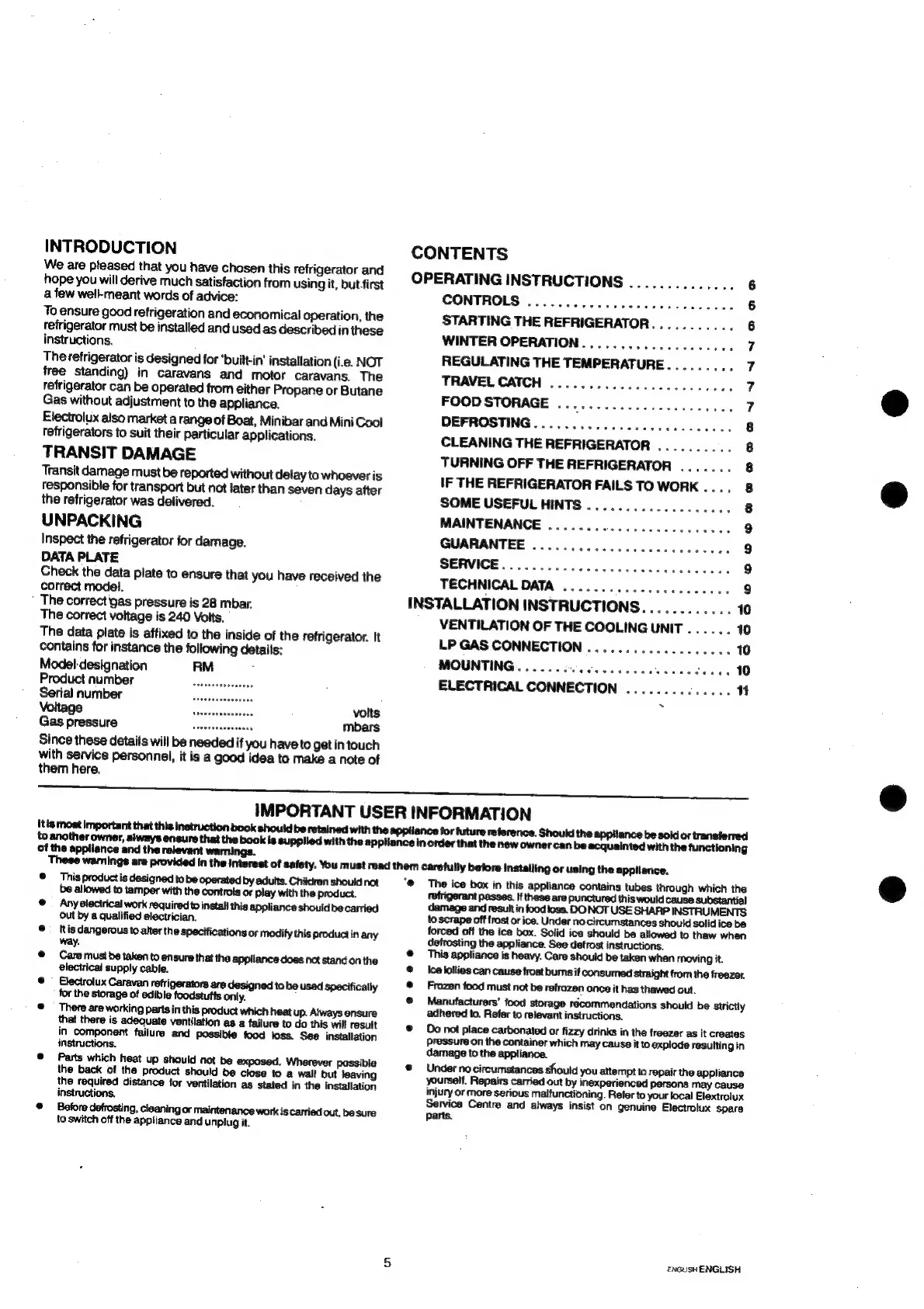 Electrolux RM2200 - Introduction and Unpacking; Transit Damage; Unpacking and Inspection; Important User Safety Information