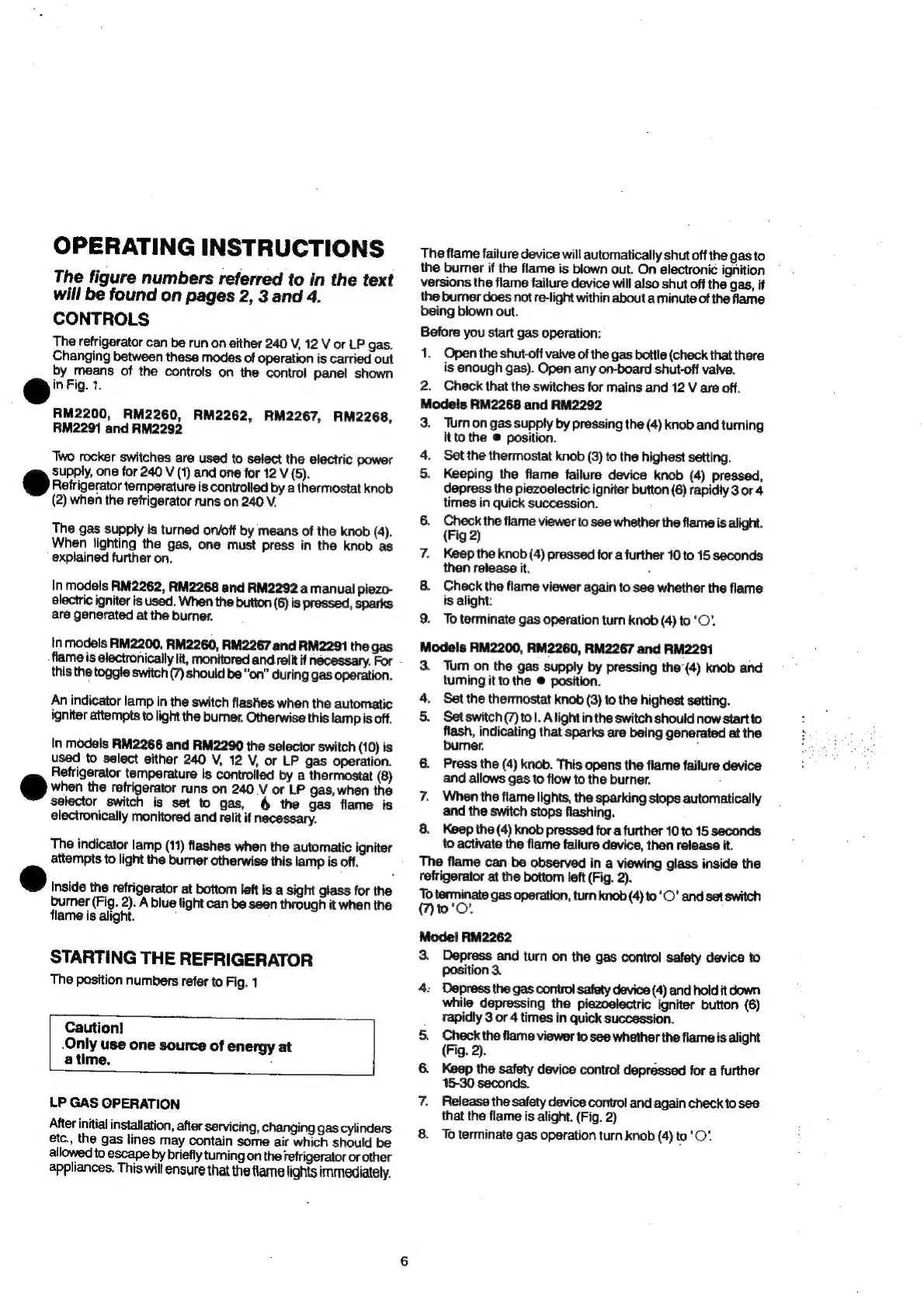 Electrolux RM2260 - Operating Instructions; Controls Overview; Starting the Refrigerator; LP Gas Operation