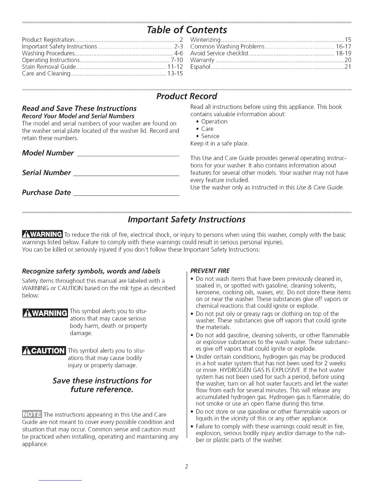 Common Washing Problems ......................................... 16-17