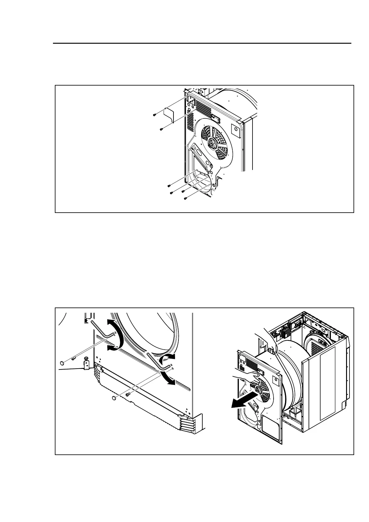 Atthefrontofthemachine:Openthedoorandremovethetwoplugs.Loosenthescrewscounter
