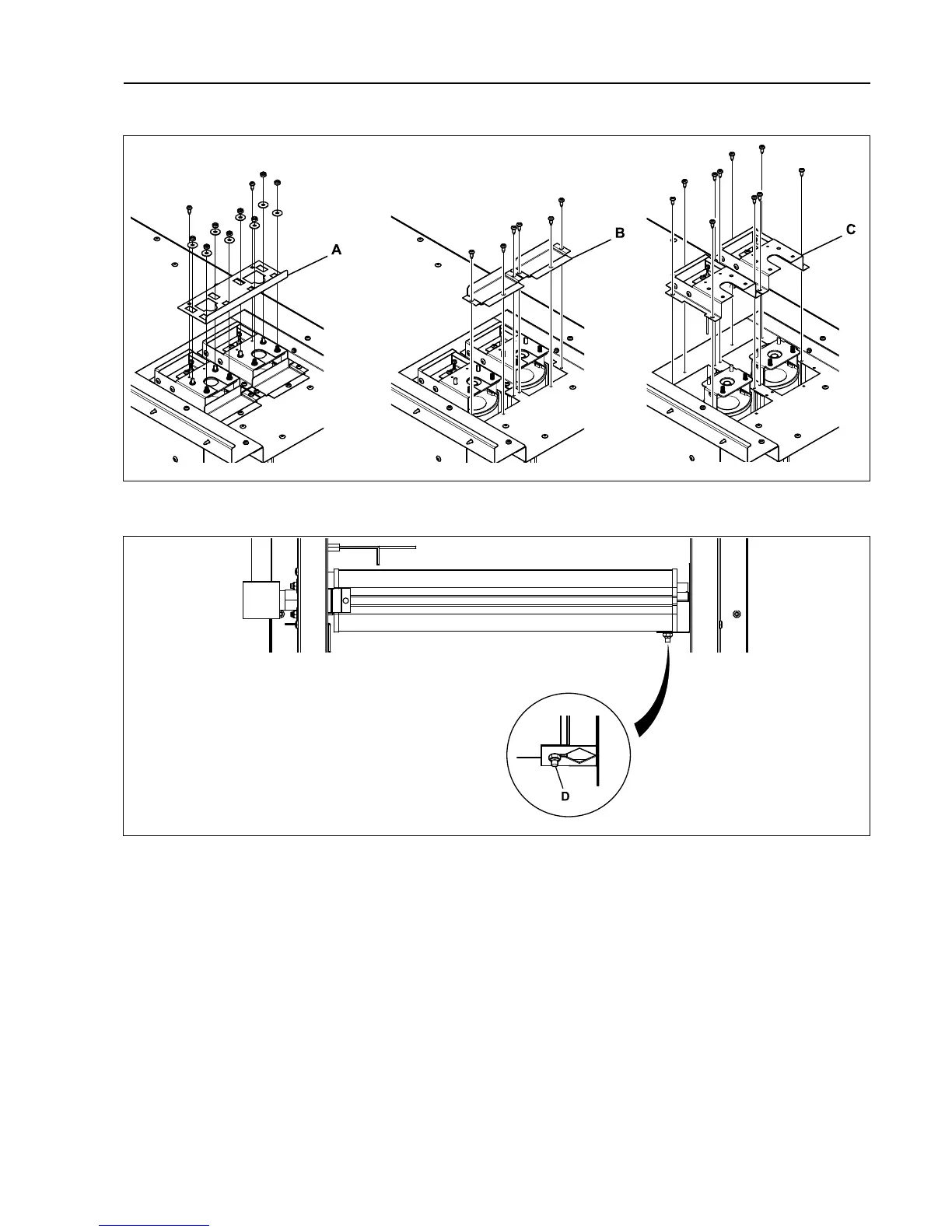 Remount the two brackets (C), the two air reducing plates (B) and the two “locking panels” (A). Fasten the gas burner