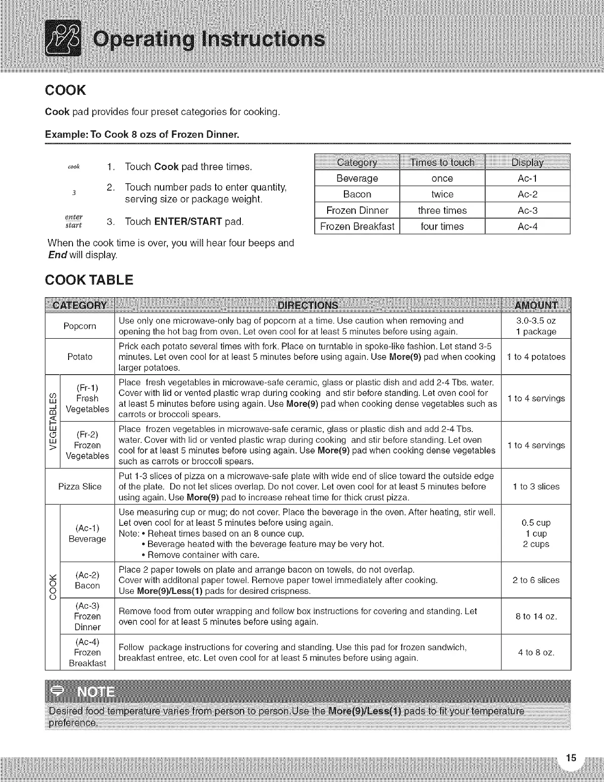 > Frozen cool for at least 5 minutes before using again. Use More(9) pad when cooking dense vegetables 1 to 4 servings