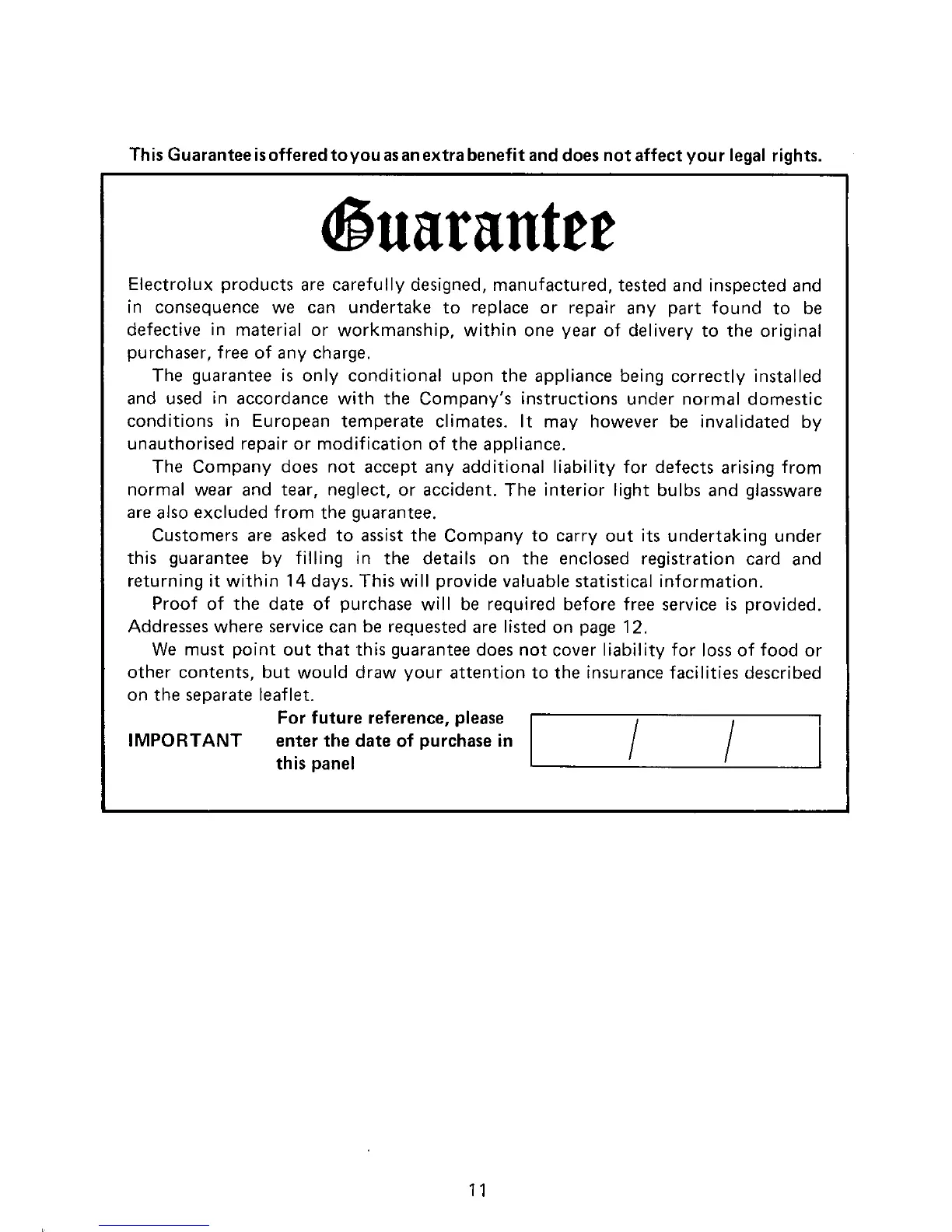 Electrolux TR1240 - Product Guarantee Information; Guarantee Terms and Conditions; Purchase Date Record