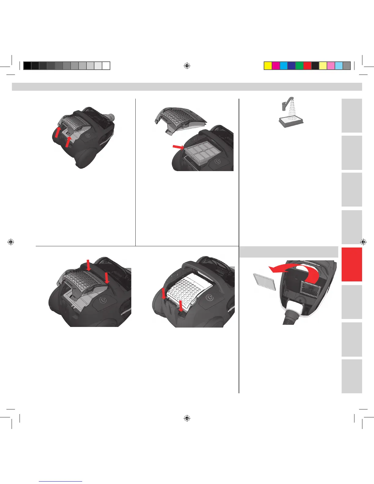 Kryt zatvorte zasunutím predných háčikov do drážok. Zatlačte kryt dopredu a dole. Potiahnutím úchytky vyberte rám ltra.