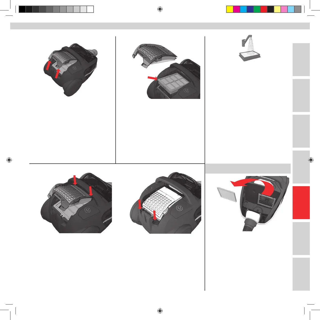 Para fechar a tampa, insira os ganchos frontais nas calhas. Empurre a tampa para a frente e prima para baixo. Puxe a pega e remova a estrutura do ltro.