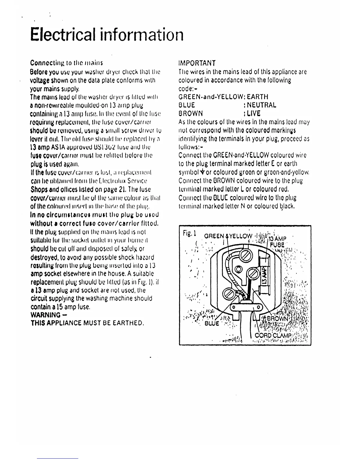 Electrolux WD1034 - Electrical Information; Mains Connection and Fuses; Wire Colour Identification