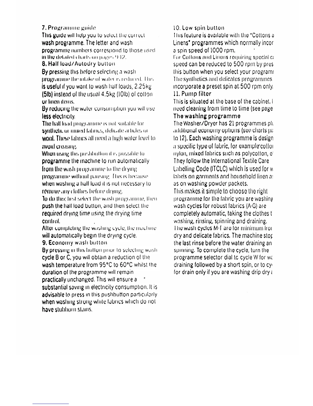 Electrolux WD1034 - Wash Programme Selection; Programme Guide and Options; Pump Filter and Programme Types