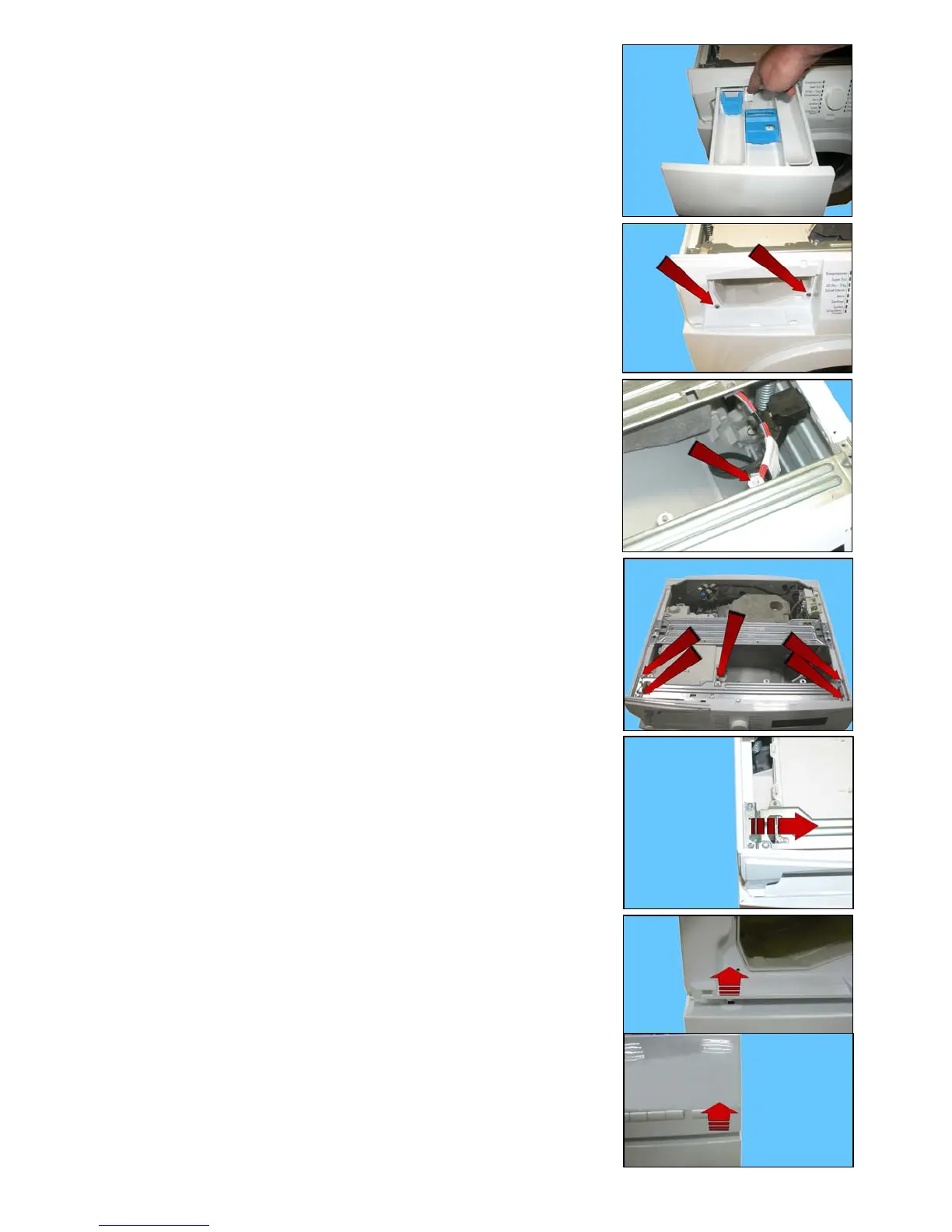 Loosen the screws that attach the control panel to the detergent tray.
