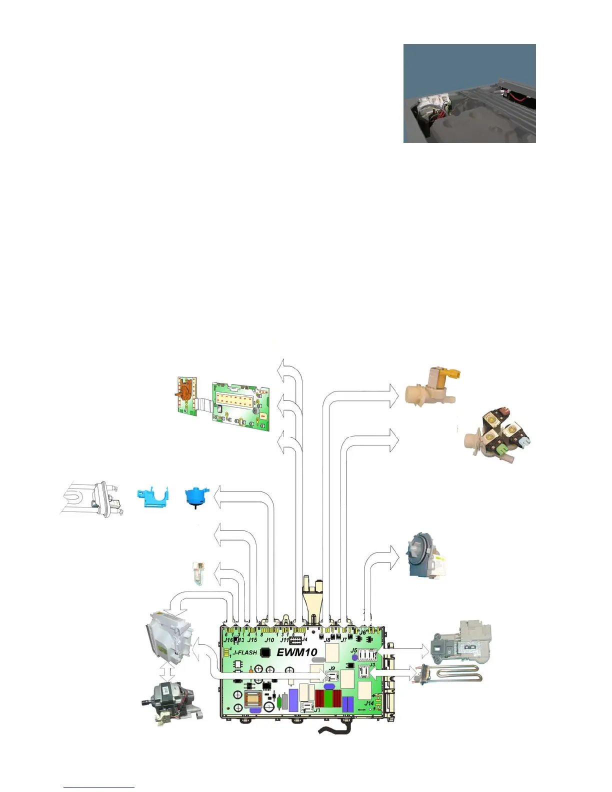 valves, motor control board, Inverter, drain pump/valve, heating element, door safety interlock, drum light.