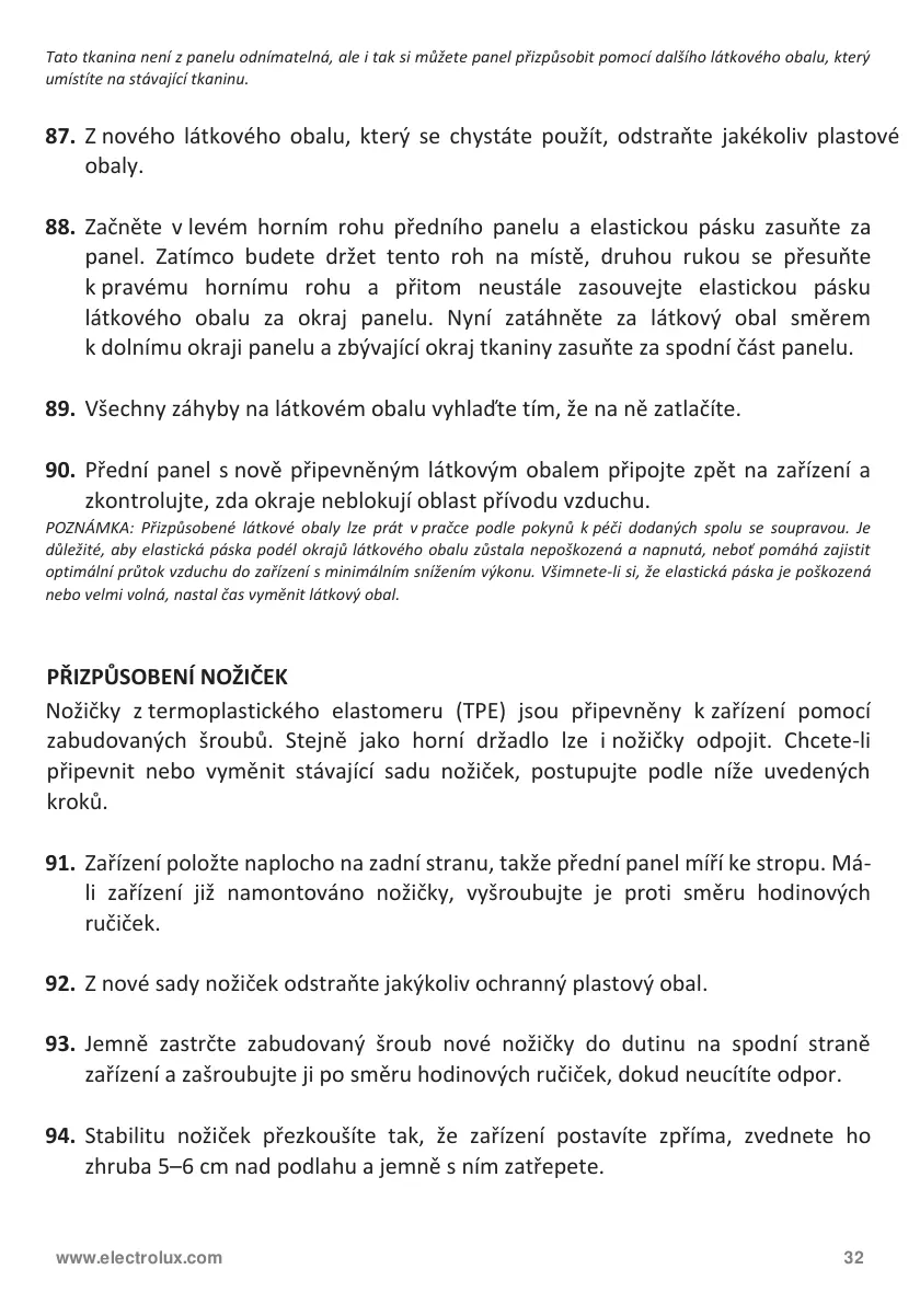 94. Stabilitu nožiček přezkoušíte tak, že zařízení postavíte zpříma, zvednete ho