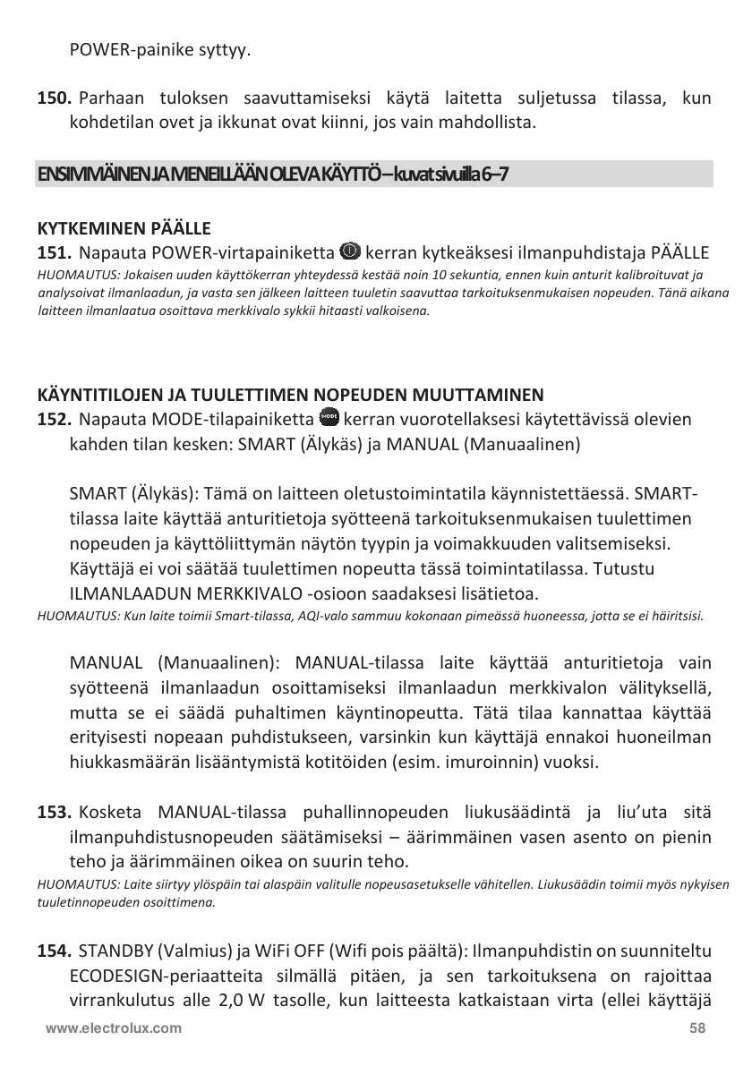 154. STANDBY (Valmius) ja WiFi OFF (Wifi pois päältä): Ilmanpuhdistin on suunniteltu