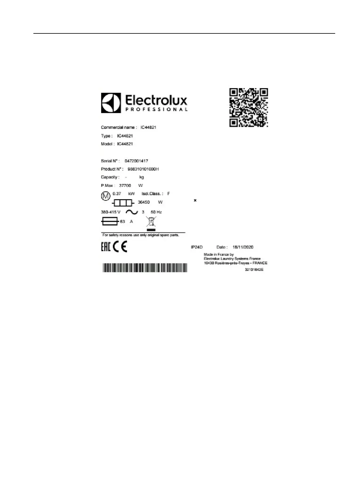 Power of the motorization in kW and its isolation class (F) .