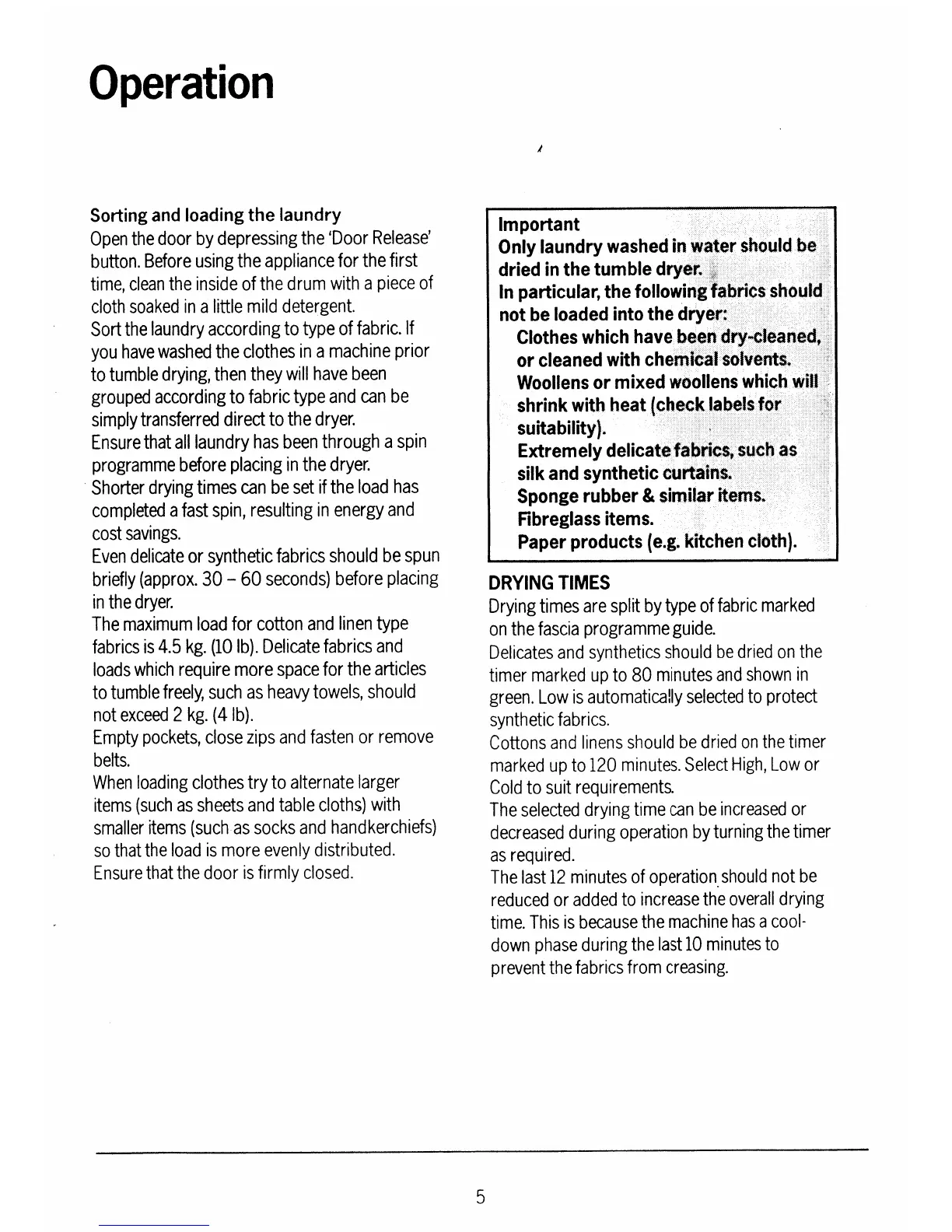 Electrolux WT252 - Operation; Sorting and Loading Laundry; Fabrics to Avoid Drying; Drying Time Selection