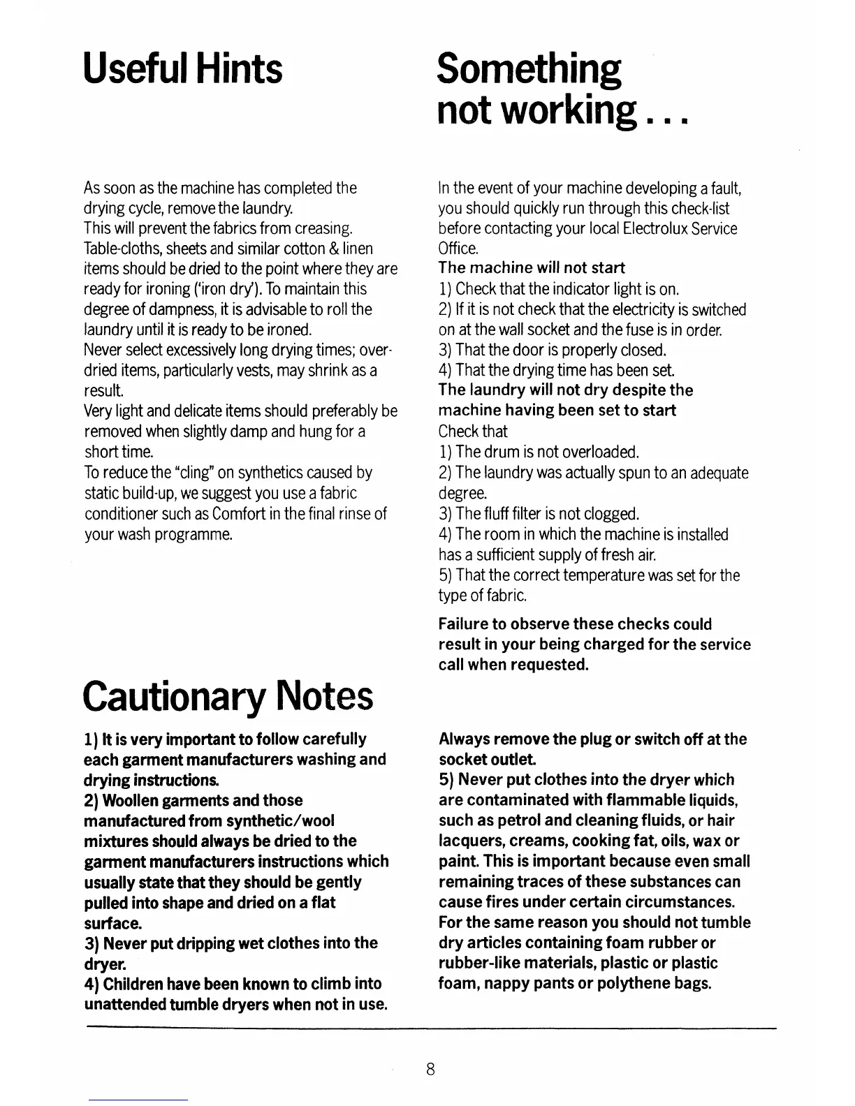 Electrolux WT252 - Useful Hints; Tips for Best Results; Safety and Usage Precautions; Troubleshooting Common Issues