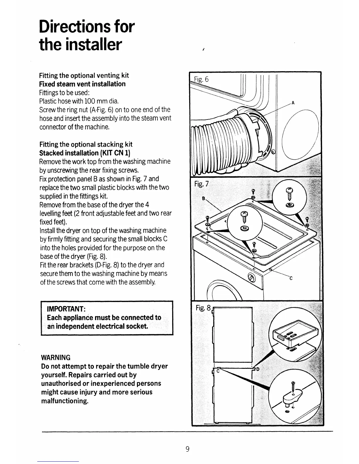 Electrolux WT252 - Directions for the Installer; Optional Venting Kit Installation; Optional Stacking Kit Installation; Electrical Socket Requirement