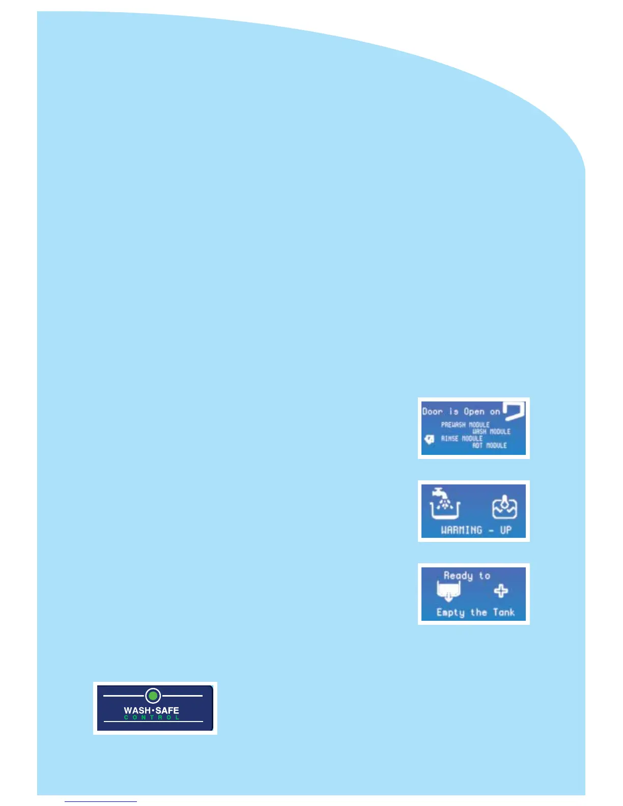 Door open - close the door / Warm up / Clean - cleaning cycle being performed / Drain / Wash /
