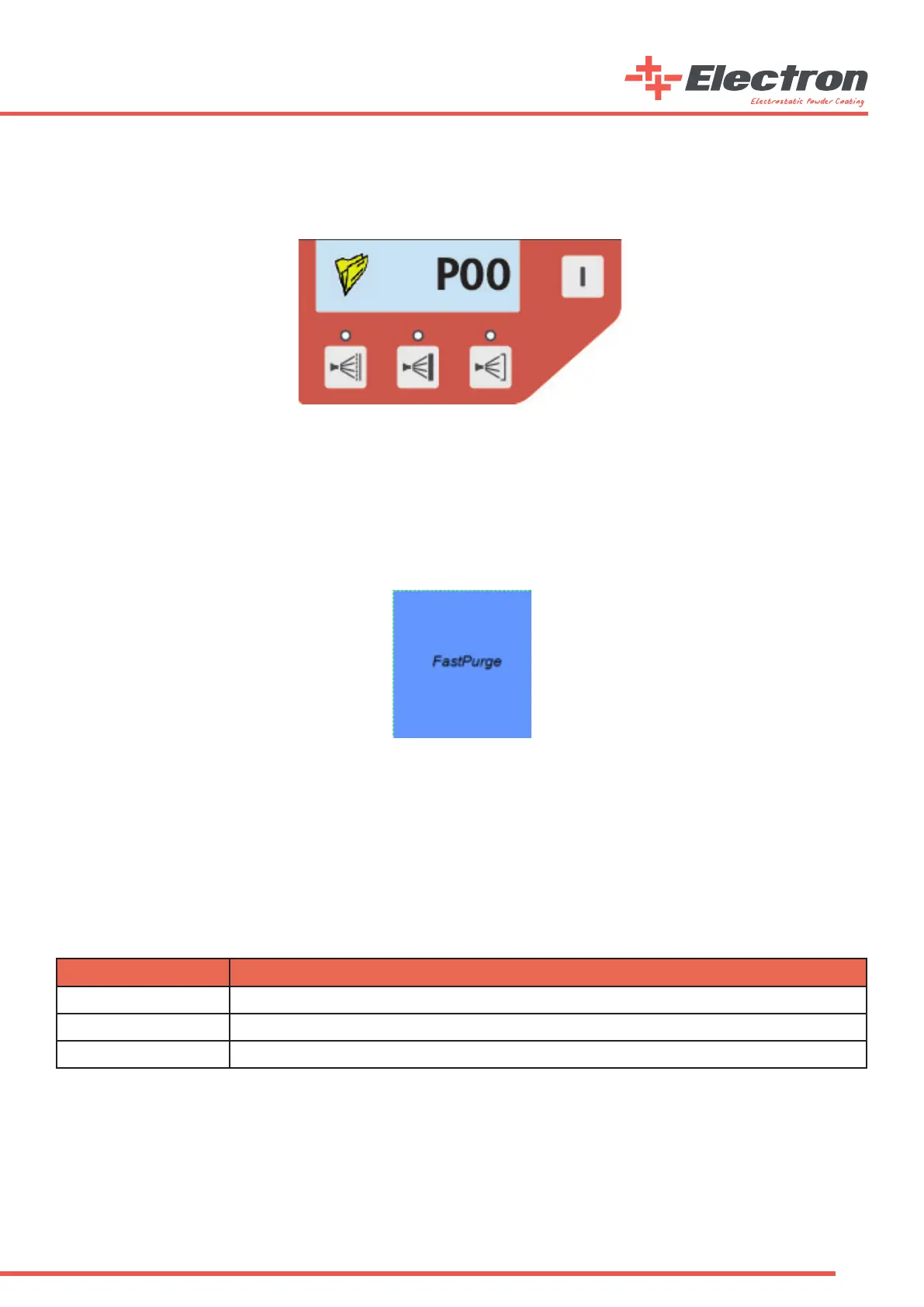 Fast Purge mode uses the high pressured air to clean the Injector, Antistatic Coating Hose and E-GUN Coating Path. A “FastPurge”